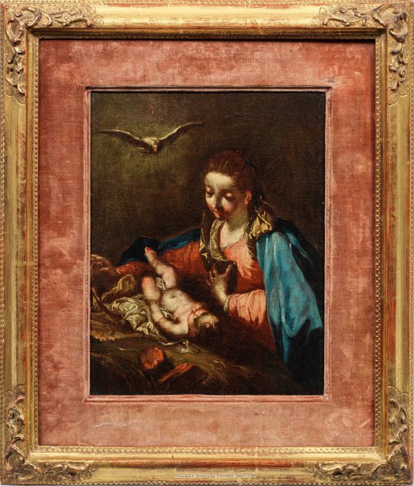 Nächtliche Szene mit dem in der Krippe auf Tüchern liegendem Kind, dem sich Maria andächtig, innig, in Liebe und Demut zuwendet, über ihm die schwebende Taube des Hl. Geistes. In der Lichtführung und im Kolorit effektvoll gemaltes, spätbarockes, um 1730-1740 gemaltes Werk des Künstlers, der neben Tiepolo als Hauptvertreter des venezianischen Rokokos gilt. Der gefragte und geschätzte Künstler war Gründungsmitglied der Akademie der Künste in Venedig und 1759-1761 deren Präsident. Pittoni erhielt viele bedeutende Aufträge aus Italien, Deutschland, Österreich und Polen. Das Gemälde ist höchstwahrscheinlich eine frühere Studie als Ausschnitt zu dem berühmten, um 1740 entstandenen, großformatigen Gemälde Pittonis "The Nativity with God the Father and the Holy Ghost" in der National Gallery in London (Inv.-Nr. NG6279; Maße 222,7 cm x 153,5 cm), wobei die vorliegende, kleine Komposition ganz auf die Figurengruppe der Madona mit dem Hl. Geist konzentriert ist. Während diese Figurengruppe weitgehend übereinstimmt, so unterscheiden sich Lichtstimmung und Farbigkeit deutlich voneinander. Der nächtlichen, effektvoll geschilderten Situation stehen ein helleres, leuchtendes Kolorit und eine weichere Lichtführung beim Londoner Bild gegenüber. Zu den weiteren vergleichbaren Gemälden zählt der um 1730 von Pittoni gemalte "Kopf der Jungfrau" ("La Tête de Vierge") im Musée des Beaux-Arts de Strasbourg in Straßburg, außerdem eine weitere Fassung der Maria (um 1730-1735) in der Staatl. Gemäldegalerie in Berlin (Inv.-Nr. 1918). Öl/Lwd., doubl.; 28,5 cm x 23,5 cm. Rahmen.