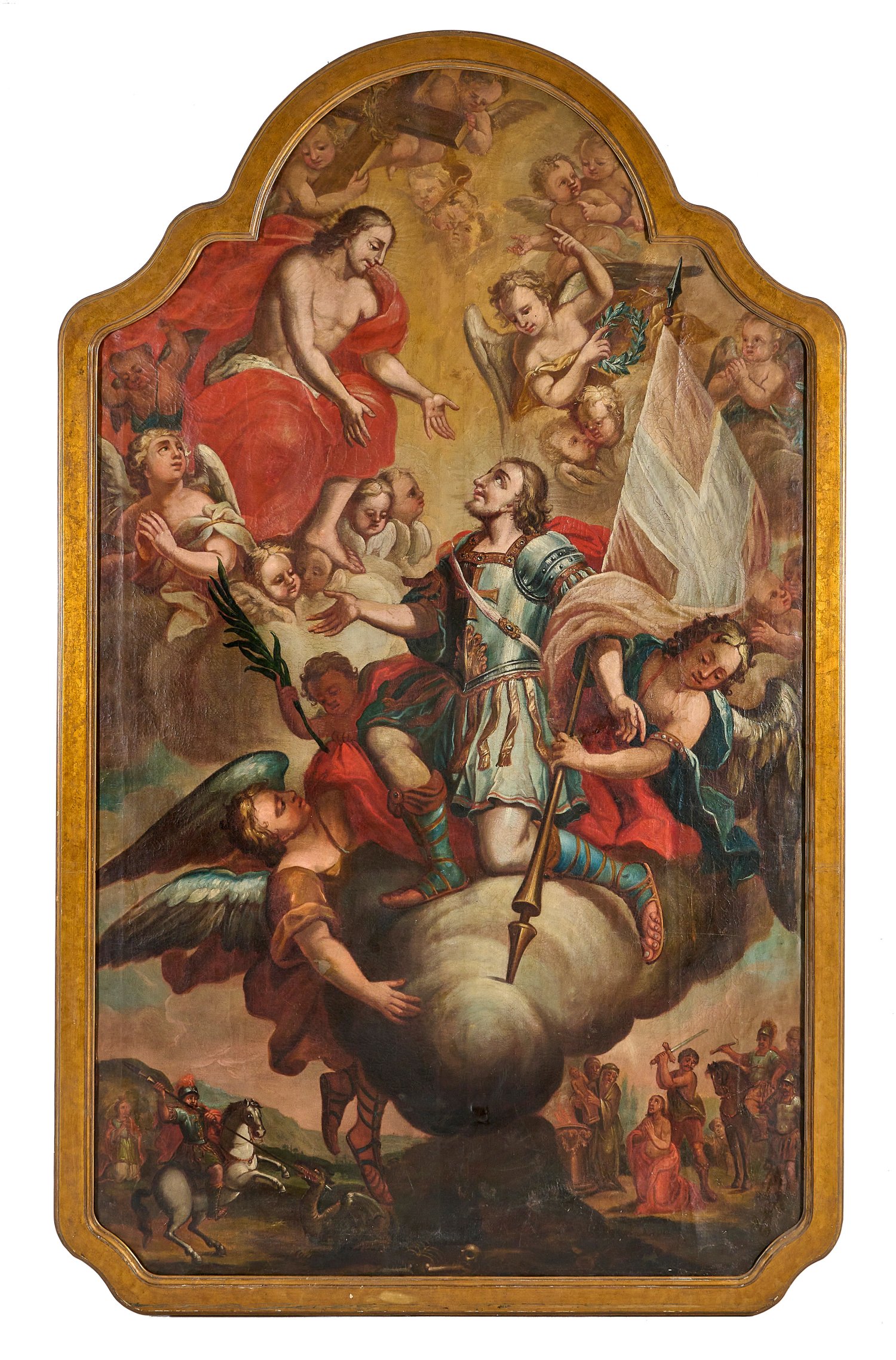 Das Gemälde verbindet mehrere Einzelszenen miteinander. In der unteren Zone kämpft der Hl. Georg mit dem Drachen und wird als Märtyrer enthauptet. Den allergrößten Teil darüber nimmt die Aufnahme des Hl. Georg als Märtyrerheiligen in den Himmel ein. Auf einem, von einem großen Engel getragenen Wolkensockel, kniet demütig der Hl. Georg in der charakteristischen Kleidung eines römischen Soldaten bzw. Ritters (jedoch mit Kreuz auf dem Brustharnisch). Zu seiner rechten Seite wird ein Engel mit Märtyrerpalme geschildert, zu seiner linken Seite ein Engel mit der Lanze verbunden mit einer Fahne, die ein weißes Kreuz auf rotem Grund zeigt. Der Heilige blickt zu Christus im Himmel und dem Kreuz, umgeben von zahlreichen weiteren Engeln. Der Hl. Georg ist ein legendärer christlicher Heiliger, welcher der Überlieferung zufolge zu Beginn der Christenverfolgung unter Diokletian (284-305) ein Martyrium erlitt und zählt zu den, seit dem Mittelalter am meisten verehrten Heiligen; er ist einer der vierzehn Nothelfer, überdies Schutzpatron verschiedener Länder, Adelsfamilien, Städte und Ritterorden sowie der Pfadfinder. Ikonographisch außergewöhnlich an diesem Gemälde ist die Simultandarstellung mehrerer Einzelszenen und die Flagge, die darauf hinweisen könnte, dass ein Johanniter- oder Malteserorden der Auftraggeber war. Öl/Lwd.; 248 cm x 146 cm. Rahmen.