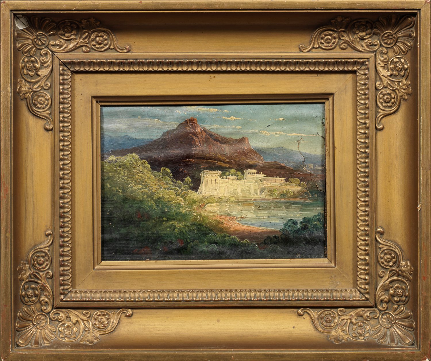 Kleinformatige Studie. Der Landschaftsmaler arbeitete mit den bedeutenden Gartenarchitekten Peter Joseph Lenné und Fürst Hermann von Pückler-Muskau zusammen. 1827-1831 verbrachte Schirmer in Italien; 1835 wurde er Mitglied der Berliner Akademie, wo er seit 1839 Landschaftsmalerei unterrichtete, 1840 oder 1843 wurde er zum Professor ernannt. Auf der Heimkehr von einer Italien-Reise starb August Wilhelm Ferdinand Schirmer im Juni 1866 in Nyon am Genfersee. Öl/Lwd., auf Holztafel kaschiert. Verso altes Etikett mit Bez. "W. Schirmer". Restaurierungsbedürftig. 15 cm x 20,3 cm. Rahmen.