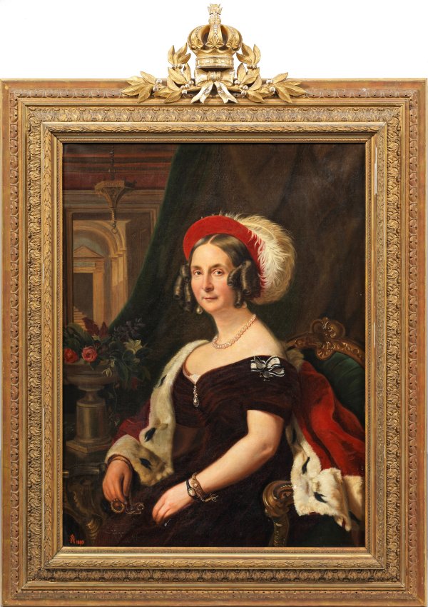 Detailgetreues Bildnis der in einem Lehnstuhl sitzenden Herzogin in dunkelrotem Samtkleid und Hermelinmantel, geschmückt mit Perlenketten, auf dem Kopf ein roter Samthut mit weißer Straußenfeder; neben ihr eine Schale mit Blumen, im Hintergrund ein Vorhang und Blick auf einen Saal. Öl/Lwd.; L. u. Ligatur-Monogramm "HA" mit Herzogskrone u. Dat. 1890. Verso ein alter Klebezettel mit handschriftlicher Bez. u. Dat. (teilw. mit Abkürzungen): "Dieses Bild der Herzogin Friederike von Anhalt geborene Prinzessin von Preußen copierte ihre Tochter die Herzogin Agnes von Sachsen-Altenburg geborene Prinzessin von Anhalt nach einem Originalgemälde des Professors Krüger aus Berlin (/) 1891". 103 cm x 76 cm. Original-Prunkrahmen mit Krone.