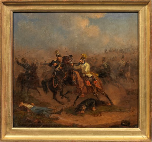 Die fein lasierend ausgeführte Darstellung der dramatischen Kampfszene zeigt eine lebendige Schilderung der Pferde in Bewegung. Im Zentrum des Bildes stehen zwei Soldaten, die mit Lanze und Degen gegeneinander kämpfen, während vor ihnen am Boden bereits zwei Gefallene liegen. Frühes Werk Behringers, der selbst als Hauptmann in der bayerischen Armee diente. Er stand in der Tradition Dietrich Montens und reüssierte als gefragter Maler militärischer Szenen und Uniformdarstellungen, die auch als Lithographien erschienen. Seit 1866 stellte Behringer u.a. im Münchener Kunstverein aus. Öl/Eichenholztafel. Rest.; R. u. sign. u. undeutl. dat. "185(1?). 52 cm x 56,5 cm. Rahmen.