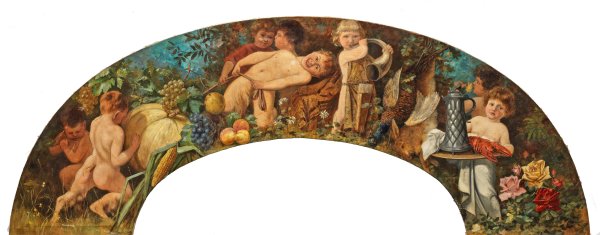 Segmentbogenförmige Komposition mit szenischer Darstellung. Auf der linken Seite junge Faune und Putti mit Früchten und beim Ziehen bzw. Hochrollen eines großen Kürbisses; auf der rechten Seite ein Putto mit Pfeilköcher und Jagdhorn neben einem Wildstillleben sowie ein weiterer Putto beim Auftragen eines Hummers und einer Schenkkanne auf einem Tablett, in der rechten unteren Ecke große Rosenblüten. Dekoratives Gemälde der Wiener Ringstraßenepoche, beeinflusst außer durch den Malerfürsten Makart, welcher in den 1870er und 1880er Jahren durch seine prunkvollen Gemälde in der Tradition von Tizian und Rubens die Kunst prägte, durch den nach ihm benannten, opulenten "Makart-Stil" auch die großbürgerlichen und adeligen Interieurs seiner Zeit. Öl/Lwd.; Ca. 82 cm x 221 cm.
