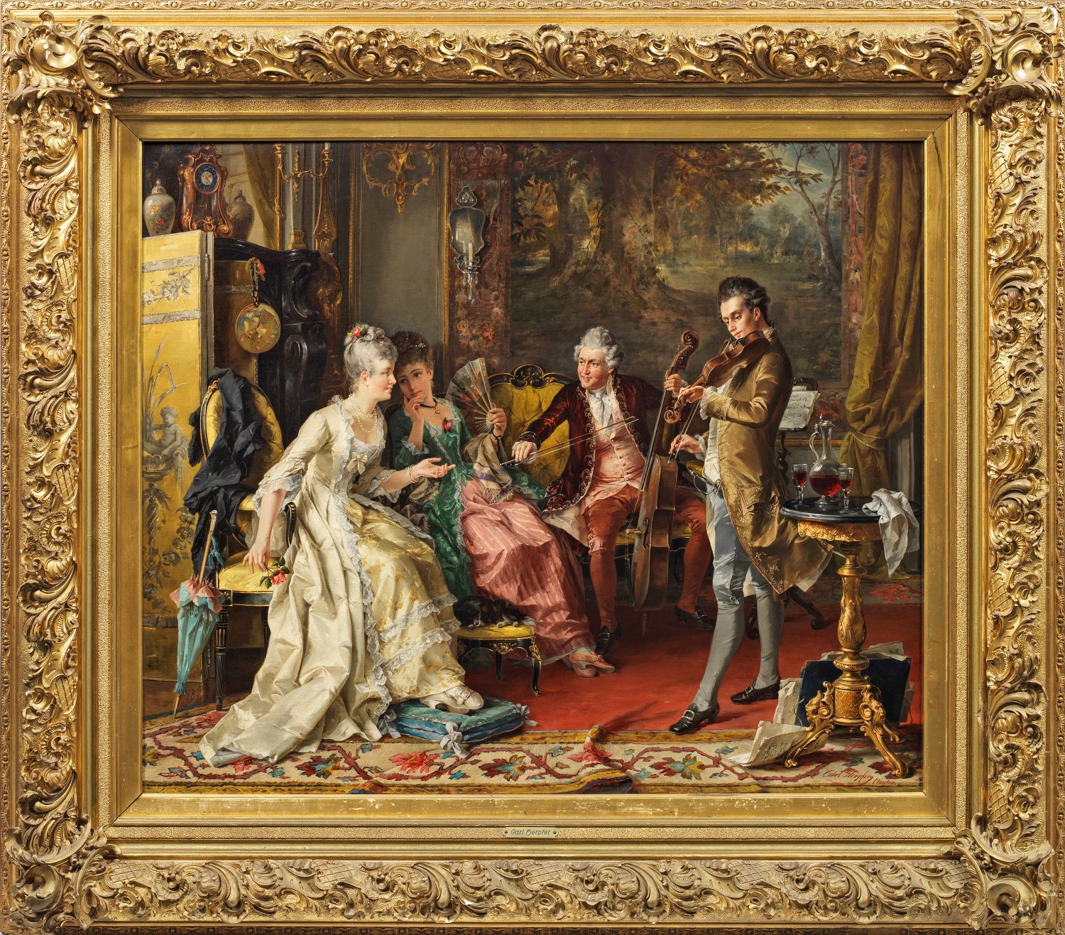 Erzählerisches, heiter gestimmtes Genrebild mit stehendem, jungem Violinisten, der durch sein Spiel oder durch seine Person eine elegante Dame fesselt, die sich mit beredter Geste vorbeugt. Während die neben ihr sitzende, weibliche Begleitung die Musik ignoriert und nur deren Interesse am Violinisten wahrnimmt, zeigt der annähernd in der Bildmitte sitzende, ältere Cellist ihr gegenüber offene Begeisterung mit wohlwollendem Lächeln und Spielfreude. Herpfer studierte ab 1854 an der Münchener Akademie bei Johann von Schraudolph, Philipp von Foltz, Karl von Piloty und Arthur von Ramberg. Ab 1869 stellte er im Münchener Glaspalast, beschickte aber u. a. die Große Berliner Kunstausstellung. Seine in ihrer Stofflichkeit künstlerisch hervorragenden Genregemälde feiern vornehmlich die aristokratische Lebenswelt des 18. Jhs., womit sie zugleich das Repräsentationsbedürfnis ihrer Zeit trafen. Sign. mit Ortsangabe München. 91,5 cm x 110,5 cm. Prunkrahmen.