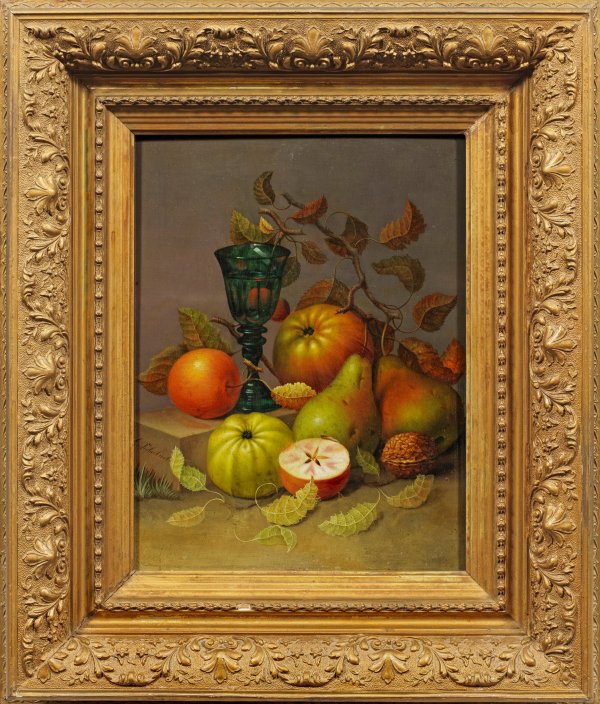 An einem kleinen Steinquader kunstvoll arrangiertes Stillleben aus Äpfeln und Birnen, einem aufgeschnittenen Apfel und einer Walnuss, auf dem Quader stehendes, grünes Kelchglas mit hineingetauchtem Früchtezweig, im Vordergrund auf dem Boden verstreute, filigrane Blätter. In fein lasierender, altmeisterlicher Malweise ausgeführtes, naturgetreues Werk aus dem kleinen bekannten Oeuvre der Malerin, die sich auf Blumen- und Früchtestillleben spezialisierte und wahrscheinlich bei ihrem Vater Willem Verbeet (1801 - 1887) lernte. In den Jahren 1854-1863 stellte sie mehrfach in ’s-Hertogenbosch, Amsterdam, Den Haag und Leuwaarden aus. Öl/Mahagonitafel. Am linken Bildrand sign. u. dat. 1856. 39,5 cm x 31 cm. Rahmen.