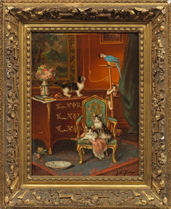 Auf einem Sessel in üppigem Rokokointerieur haben es sich zwei Katzen bequem gemacht, während zwei weitere dahinter übermütig spielen und versuchen, einen Papagei zu fangen. Duftig gemaltes, in seiner höchst lebendig wirkenden Tierschilderung typisches Werk des Künstlers, der auf Katzenmotive spezialisiert war und besonders häufig deren Spiel darstellte. Öl/Holztafel. R. u. sign. 34,8 cm x 27,1 cm. Rahmen.