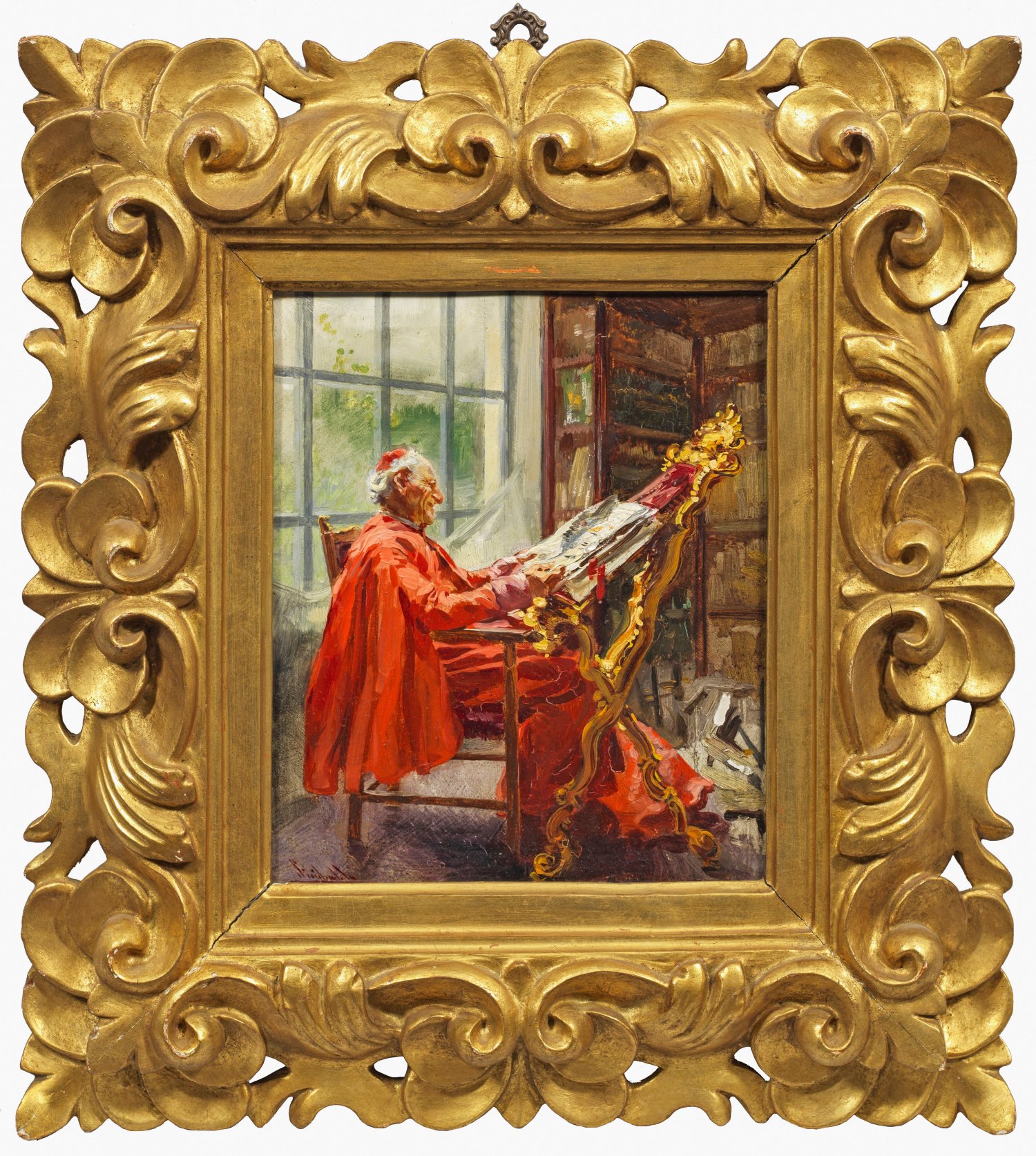 In leuchtender Farbigkeit angelegte, charakteristische Genreszene des italienischen Malers, der Schüler von Salvador Sánchez Barbudo in Rom war und sich auf historisierende Genresujets in ausdrucksstarkem, lebendigem Kolorit spezialisierte. Öl/Holz . L. u. sign. 24,2 cm x 20,2 cm. Rahmen.