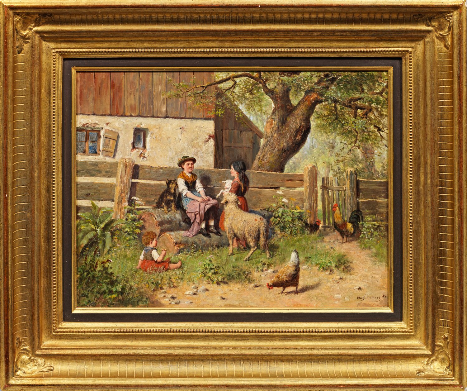 Reizvolles, feinmalerisches Genrebild, das eine junge Frau in bayerischer Tracht darstellt, wie es auf Baumstämmen vor einem Gehöft sitzt und von einem Mädchen und einem Kleinkind sowie von Hühnern, einem Schaf, einem Lamm und einem Hund umringt wird. Feinfühlig charakterisiertes, in fein nuanciertem Kolorit ausgeführtes Werk des oberbayerischen Genremalers, der an der Münchner Akademie ausgebildet wurde. Öl/Mahagonitafel (Malwarenetikett von Schachinger & Herrmann, München). R. u. sign. und dat. (18)84. 33 cm x 43,5 cm. Rahmen.