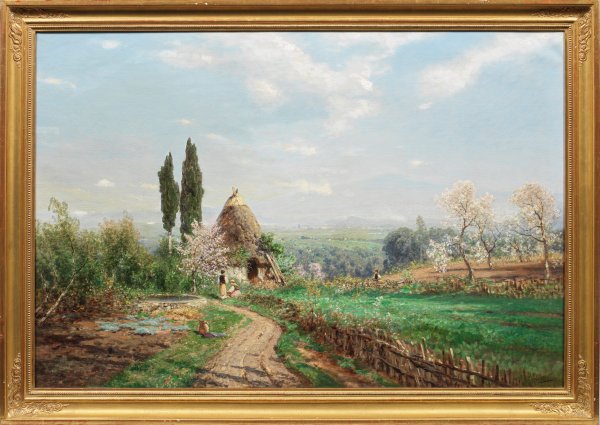 Heitere, harmonische, lichtdurchflutete Landschaft mit weitem Blick von einem erhöhten Standpunkt auf die Campagna-Ebene. Im Vordergrund eine pittoreske Hütte mit kegelförmigem Dach, zwei in den Himmel ragenden Zypressen und blühenden Obstbäumen, als Staffage ein junges Paar und eine weitere, einzelne Figur. In hellem, pastelltonigem Kolorit und teilw. weich-pastosem Farbauftrag gemalte Stimmungslandschaft. Lutterroth studierte 1864-1867 bei Oswald Achenbach an der Düsseldorfer Akademie. 1868-1870 verbrachte Lutterroth in Rom und unternahm Studienreisen durch Italien. Zurückgekehrt in seine Heimatstadt erlangt er weit über Hamburg hinaus einen bedeutenden Ruf als Landschaftsmaler. Besonders das Kronprinzenpaar Friedrich Wilhelm und Victoria schätzten ihn persönlich. Eines seiner Hauptsujets waren italienische Landschaften und Venedig-Motive. Öl/Lwd.; R. u. sign. Verso betitelt u. bez. "A Lutteroth Hamburg Uhlenhorst". 80,5 cm x 118,5 cm. Rahmen.