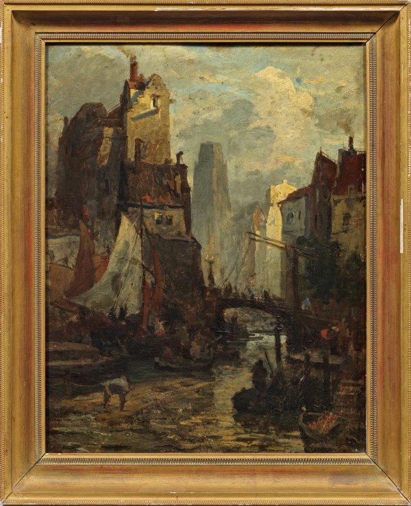 Das hochformatige, in flotter Pinselführung gemalte Werk Schönlebers gibt den Blick vom Kanal auf St. Laurens (Laurenskerk) in Rotterdam frei. Während seiner Studienjahre in München reiste Schönleber ab 1873 in die Niederlande, um Motive für seine im Atelier ausgearbeiteten Gemälde zu sammeln. Ab 1880 als Professor an die Karlsruher Kunstschule berufen, schuf er dort durch neue Impulse in der Landschaftsmalerei besondere Darstellungen des Lichts und vermittelte so seinen Schülern wie Friedrich Kallmorgen die neue Kunstströmung des Impressionismus. Öl/Holztafel. R. u. sign. und dat. München 1874; 49 cm x 38 cm. Rahmen.