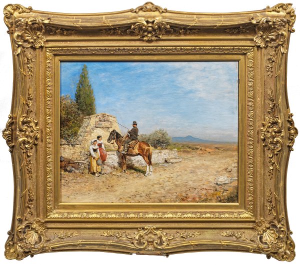 Zwei italienische Mädchen und ein Reiter bei der Rast an einem Brunnen in der Campagna Romana