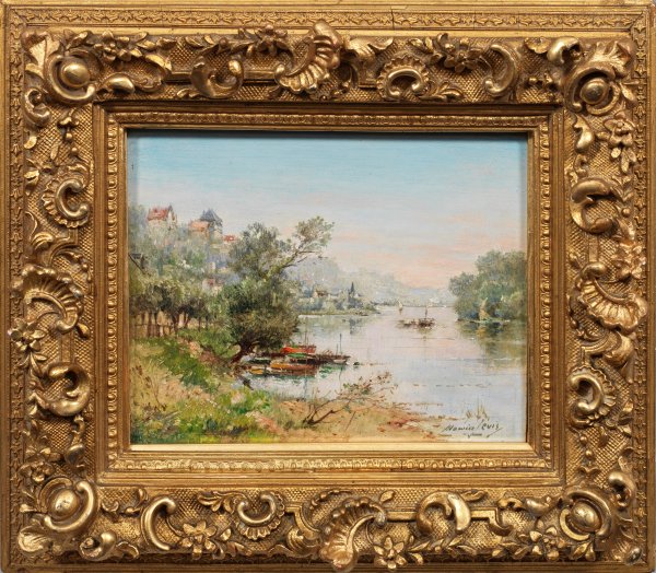 In zarten, duftigen Farben gemalte Partie an der Seine. Äußerst stimmungsvolle, mit lockerem, schwungvollem Pinselstrich gemalte Impression, des bei Harpignies und Jules Lefebvre ausgebildeten Künstlers. Ab 1888 zeigte Levis seine der Barbizon-Schule verpflichteten Landschaften u.a. regelmäßig in den Ausstellungen der "Societaire des Artistes Francais". Öl/Holzplatte. R. u. sign.; Verso auf einem Papieretikett betitelt und sign.; 19,3 cm x 24,3 cm. Rahmen.