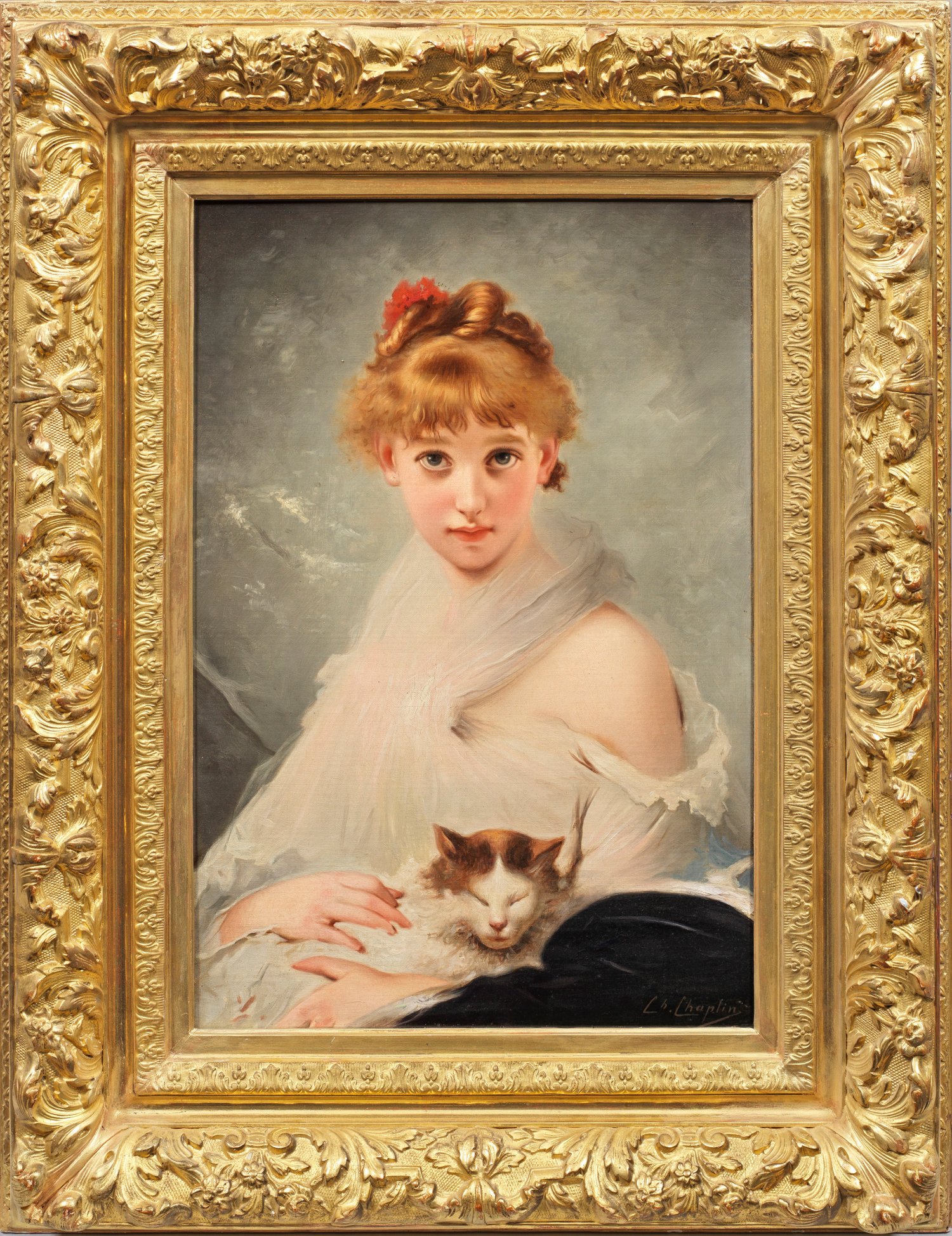 Reizvolles, feinfühlig charakterisiertes Bildnis eines jungen Mädchens in zartem, weißen, wallenden Kleid, das ihre Katze liebevoll in den Armen hält und den Betrachter sanft und direkt anblickt. Feinmalerisch ausgeführtes, virtuos nuanciertes Werk Chaplins, dessen Motiv der Künstler vielfach umsetzte, u. a. in einer Variation mit einem Hund. Ausgebildet bei Michel-Martin Drollings schuf Chaplin anfänglich Landschaften, widmete sich aber später der sogn. Boudoirmalerei in der Tradition der Arbeiten von François Boucher (1703 - 1770). Öl/Lwd., doubliert auf Platte; R. u. sign.; 54,7 cm x 37,7 cm. Rahmen.