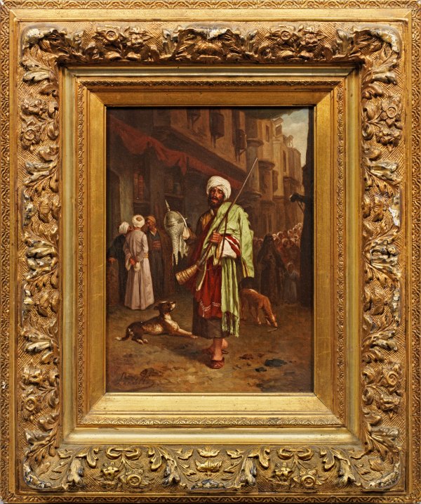 In einem engen, stark belebten, nordafrikanischen Straßenzug bietet ein junger Mann seine Waren - einen silbernen Helm mit Kettenschutz und ein Gewehr - feil, während zwei Straßenhunde zu seinen Füßen nach essbaren Abfällen suchen. Charakteristisches Kabinettbild des französischen Malers, der sich 1837 auf Anregung von Ary Scheffer an der École des Beaux-Arts als Schüler bei Paul Delaroche einschrieb. Mit anfänglich überwiegend religiösen und historisch geprägten Werken absolvierte Landelle 1841 sein Ausstellungsdebüt. Ab 1965 unternahm er Reisen in den Mittleren Osten und Nordafrika, u.a. bereiste er Marokko, Algerien und Ägypten, und widmete sich fortan verstärkt dem Orientalismus, wobei sich seine Werke mehr durch Sentimentalität, denn durch ethnographische Korrektheit auszeichnen. Öl/Mahagonitafel. L. u. sign.; 32 cm x 23,8 cm. Rahmen.