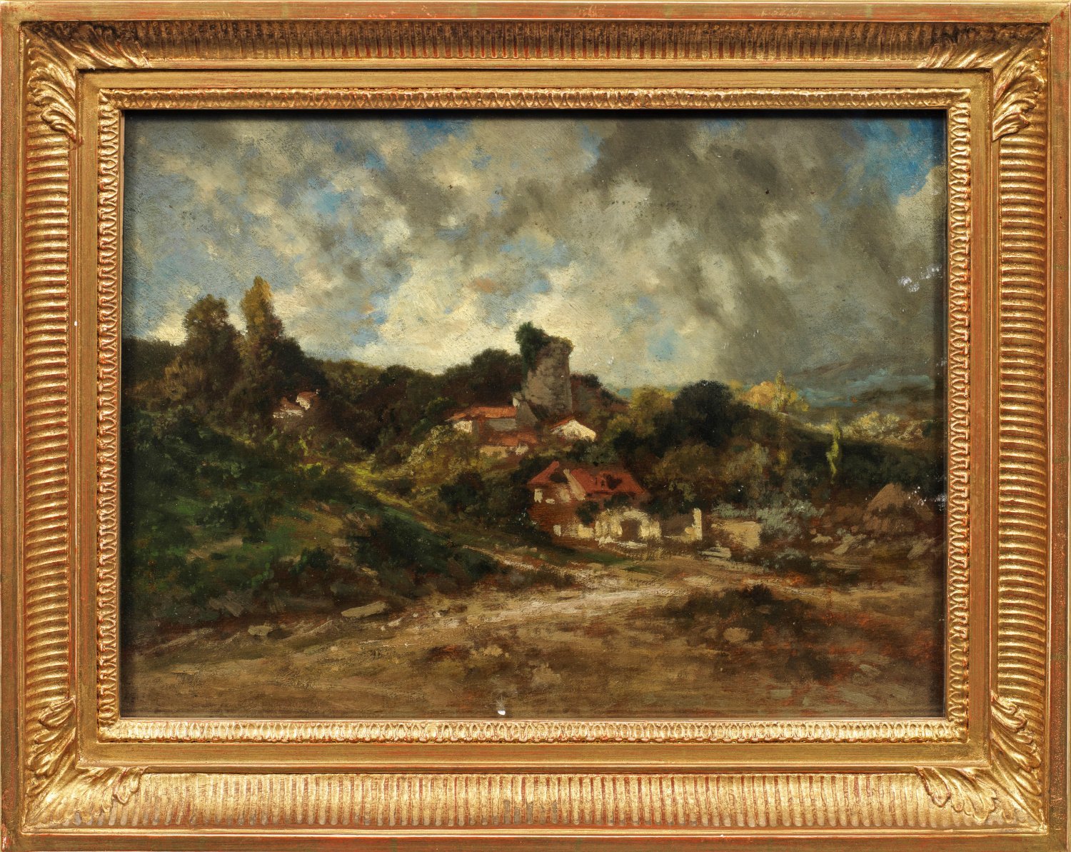 Seltene, von der Schule von Barbizon beeinflusste, impressiv aufgefasste Landschaft des Künstlers, dessen Oeuvre vornehmlich Genreszenen umfasst. Brillouin studierte seit 1840 an der École des Beaux-Arts in Paris und debütierte 1843 auf dem Salon, wo er danach des Öfteren ausstellte. Öl/Holztafel. Verso handschriftliche Echtheitsbestätigung der Enkelin des Künstlers. 26,2 cm x 36 cm. Rahmen.