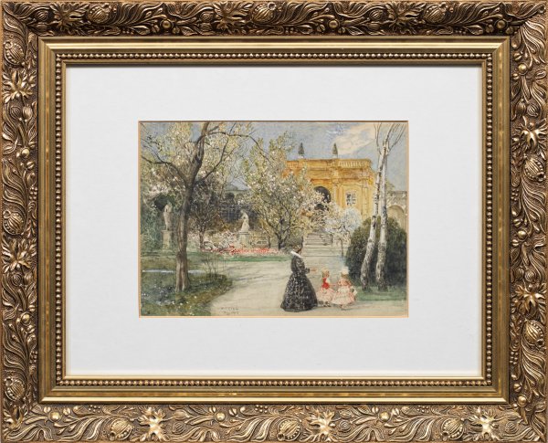 In Festtagskleidern flanierende Dame mit ihren zwei Töchtern auf den Wegen eines herrschaftlichen Stadtparks mit Palais. Frühlingshafte, duftig locker ausgeführte Momentaufnahme Veiths, der Schüler bei Ferdinand Laufberger war und seine Ausbildung in Paris abschloss. Seit 1890 war er Mitglied des Wiener Künstlerhauses und lehrte später an der renommierten Kunstgewerbeschule, wo er 1920 zum ordentlichen Professor ernannt wurde. 1896 erhielt Veith auf der Internationalen Kunstausstellung in Berlin eine Goldmedaille. Aquarell und Deckweiß/Papier, kaschiert auf Karton. Unten mittig sign. u. dat. 14.5.1917. Verso betitelt und mit Ortsangabe Augsburg. Blatt 18 cm x 25,2 cm. Karton 19,4 cm x 26,5 cm. Rahmen.