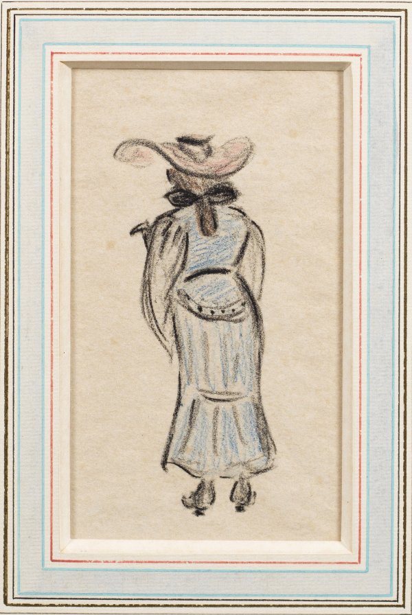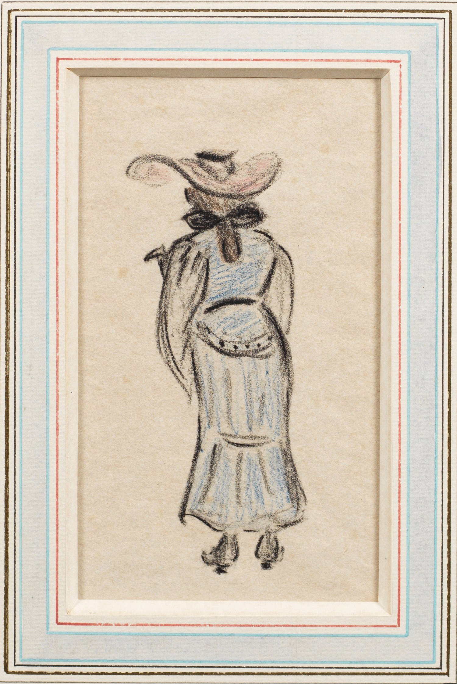 Humorvolle Zeichnung einer jungen Berlinerin in einem eleganten Kleid und mit überdimensionalem Hut. Das Blatt zeigt Zilles außergewöhnliches Talent, die Charakteristik, Eigenart und das Wesen der jeweils dargestellten Menschen sowohl als Individuum und auch als Typen zu erfassen. Dies gelingt ihm, indem er sich ganz auf das Wesentliche beschränkt und seine Figurenschilderung komprimiert. Mit wenigen, weichen, schwingenden Linien und Strichen erfasst er die Umrisse und den Körper, hinzukommt eine dezente, flächige Kolorierung. Kohlezeichnung mit farbiger Kreide/Japan. Verso zwei Nachlassstempel in Rot "Heinrich Zille" (Rosenbach 1) und "Nachlaß Prof. Heinrich Zille" (Rosenbach 4). Montagespuren, leicht lichtrandig, gebräunt und stockfleckig. 18,7 cm x 13,2 cm. Rahmen.