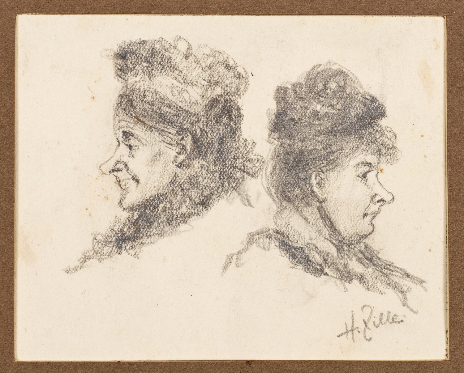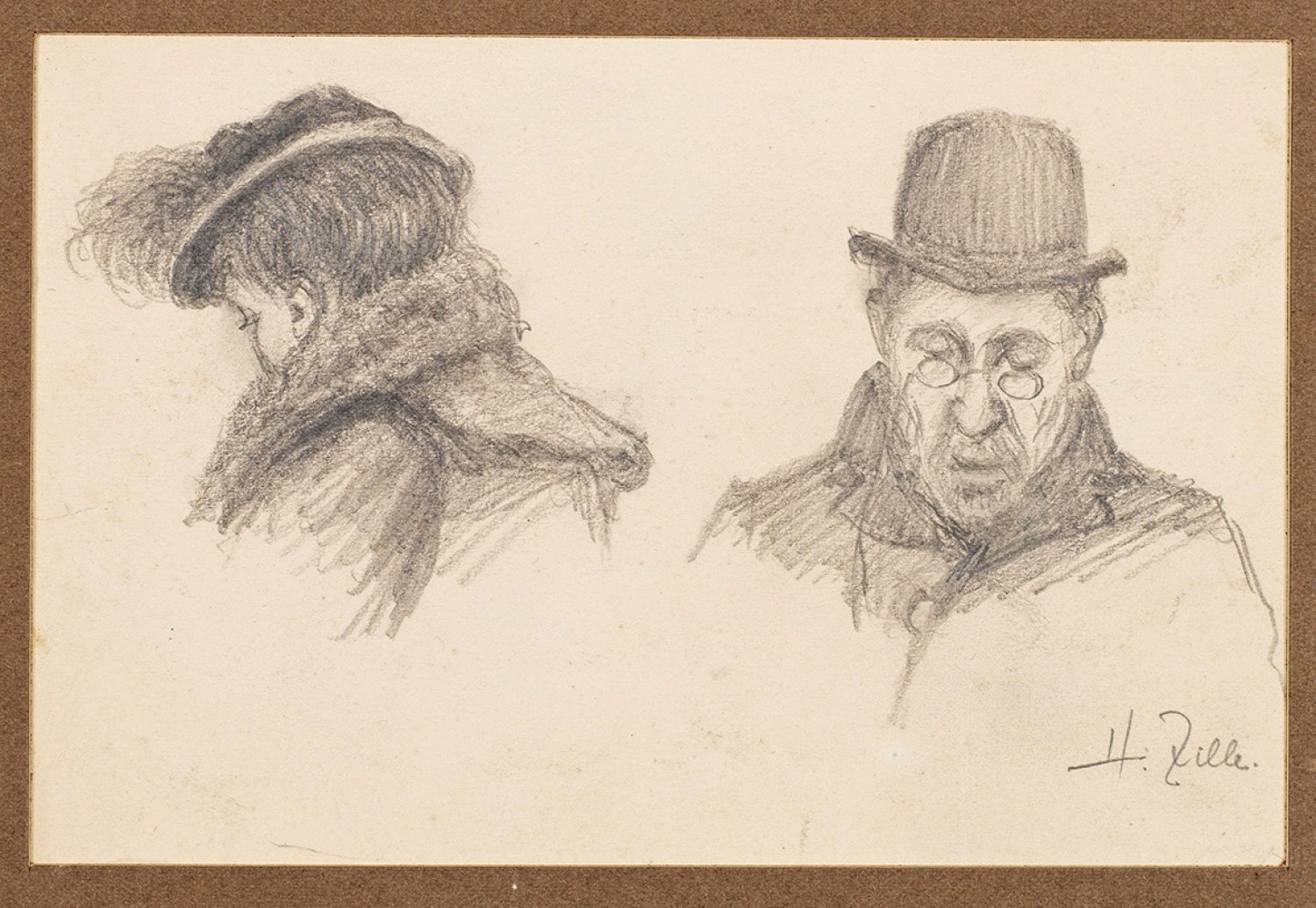 Seltene, außergewöhnliche Zusammenstellung von männlichen und weiblichen Porträts aus einem höchstwahrscheinlich von Zille selbst angelegten, zur Hälfte noch vorhandenem Skizzenbuch. Sie spiegeln eine scharfe Beobachtungsgabe wider, wie sie vor ihm der ebenso manische Zeichner Adolph von Menzel (1815 - 1905) entwickelte hatte. Stilistisch und technisch, aufgrund der teilw. feinen, detailreichen, realistischen Darstellung und der Verwendung des Bleistifts dürften die Blätter dieses Studienbuchs um 1900 oder vielleicht noch davor entstanden sein. Meist schildert er Köpfe im Profil, um das Markante, Charakteristische, Individuelle, aber auch "Typen" seiner Zeitgenossen von jung bis alt in Berlin, besonders in seinem "Milljöh" in Charlottenburg, zu erfassen. Ein Blatt hat Zille explizit "Nachbarn" betitelt. Im Hintergrund dieser Zeichnungen steht der Unterricht, den er bei dem Maler, Illustrator und Karikaturisten Theodor Hosemann (1807 - 1875) genommen hatte, ein humorvoller und präziser Beobachter des Altberliner Kleinbürgers und Spießers. Hosemann gab seinem Schüler Zille den Rat mit auf den Weg: "Gehen Sie lieber auf die Straße raus, ins Freie, beobachten Sie selbst, das ist besser als nachmachen (...). Bleistift/Papier, in ein Album mit Passepartout-Seiten aus braunem Karton. Jeweils sign.; 8-13,5 x 9 cm-17 cm (Passepartoutausschnitt). Album besch.;