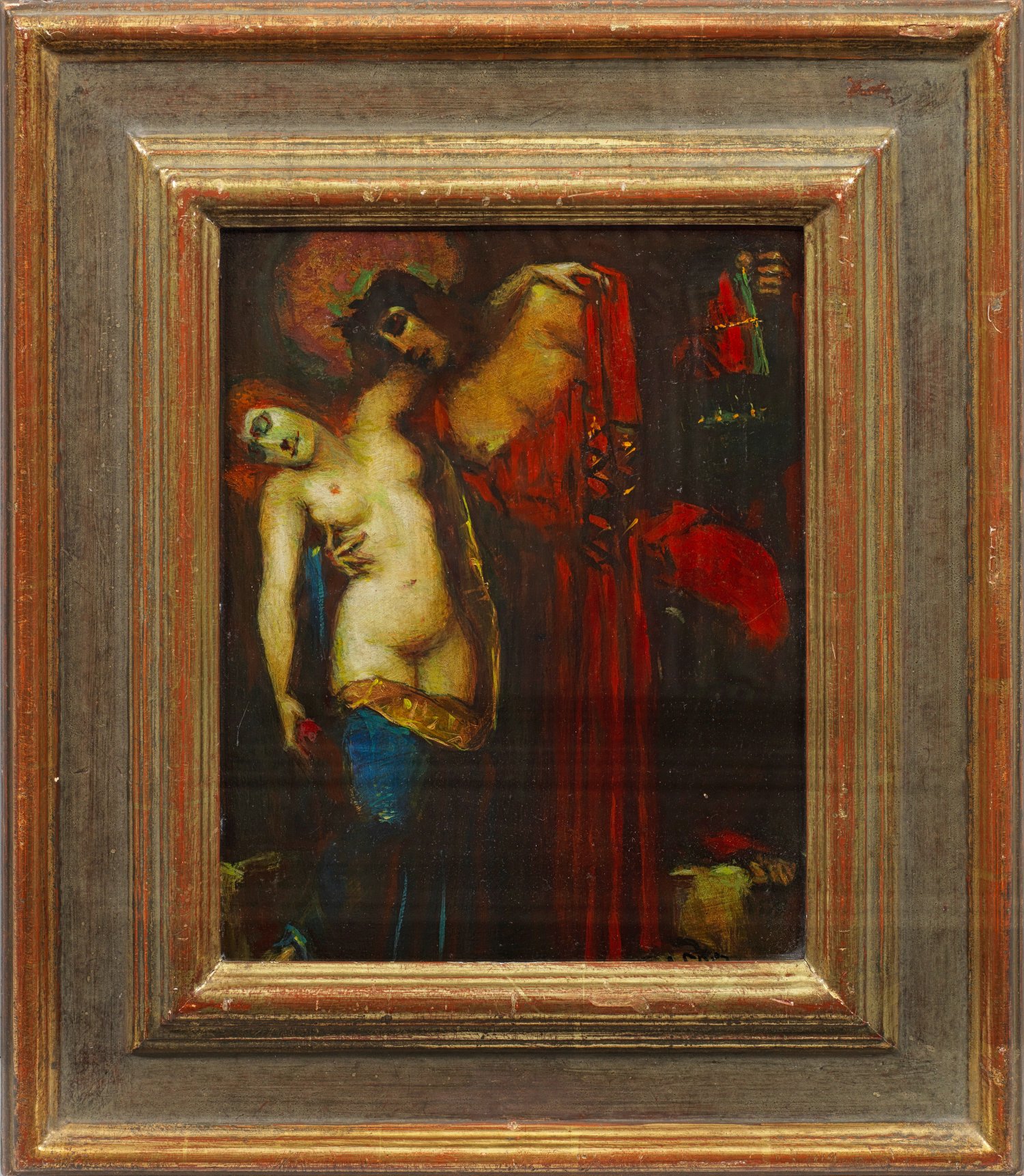 Szenische Darstellung eines jungen Recken in leuchtend rotem Gewand, der einen weiblichen Akt hält, um ihn fortzutragen. Feinflüssig gemaltes, symbolistisches, durch seine Licht- und Farbeffekte stiltypisches Werk Frey-Moocks, wohl mit einem Motiv aus der nordischen oder antiken Mythologie. Frey-Moock ging 1902 nach München, wo er seit 1904 an der Akademie bei Karl Raupp und Wilhelm von Diez studierte und 1904 Assistent von Franz von Stuck wurde. In seinen Werken wurde er intensiv sowohl durch Stuck als auch von Arnold Böcklin beeinflusst. Öl/Hartfaser. R. u. Rest-Sign.; Ger. beschnitten. 30,5 x 25,5 cm. Rahmen.