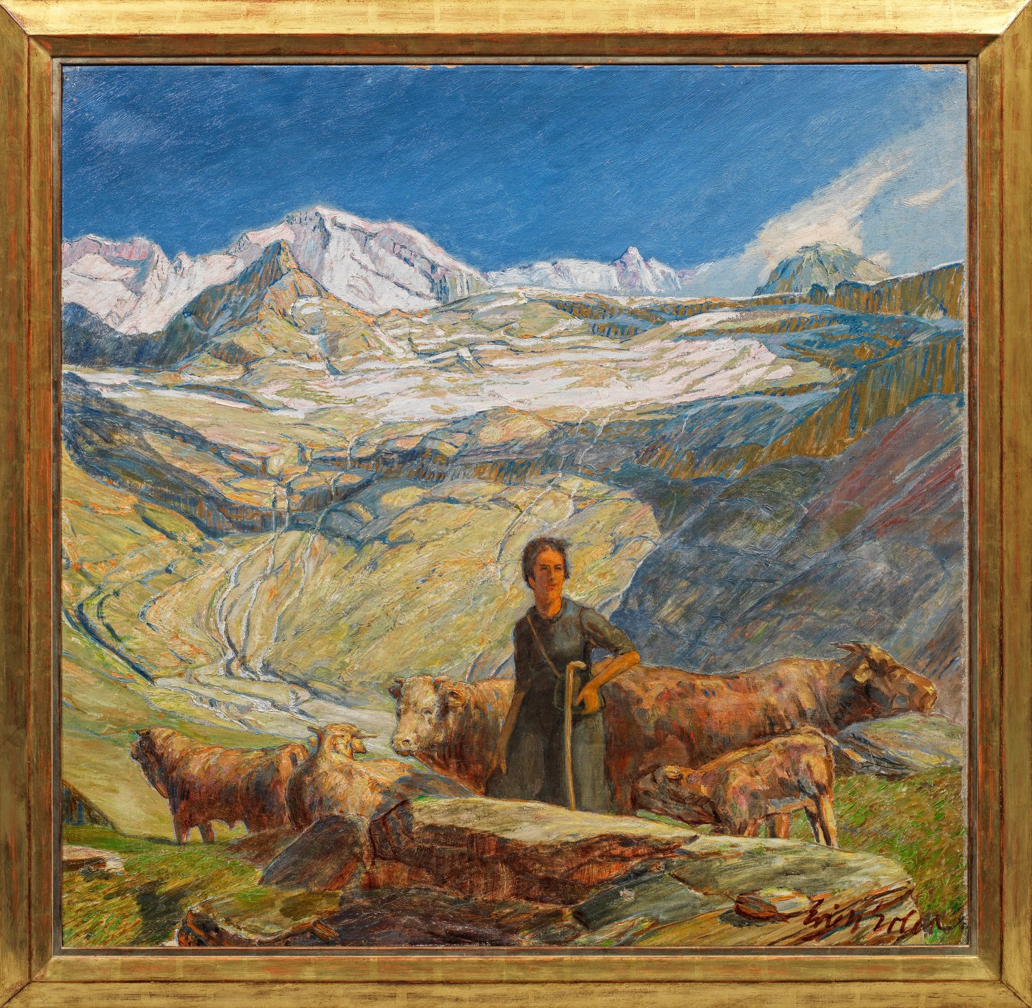 Auf einer saftig-grün bewachsenen Hochalm vor monumentaler, rauer Alpenkulisse, die durch eine äußerst effektvolle Licht- und Schattenführung in Szene gesetzt wird, ist eine einfache Hirtin mit ihren Rindern dargestellt. Repräsentatives Werk Erlers, der vorwiegend durch seine Motive aus dem Engadin bekannt wurde. Als gelernter Buchdrucker war er zunächst als Redakteur tätig und fertigte anfänglich überwiegend Zeichnungen an. 1898 verweilte Erler erstmals in Samaden (Samedan) im Engadin zur Behandlung seiner Tuberkulose. Dort machte er Bekanntschaft mit dem Malerkollegen Giovanni Segantini, der ihn in der Wahl seiner Motive und in seiner Malweise nachhaltig beeinflusste. Davon ausgehend fand Erler in seinen lyrischen Hochgebirgslandschaften zu einem ganz eigenen, flächig stilisierten Malstil mit klaren Formen und furiosem Kolorismus. Öl/Lwd.; R. u. sign.; 95,5 cm x 100,5 cm. Rahmen.