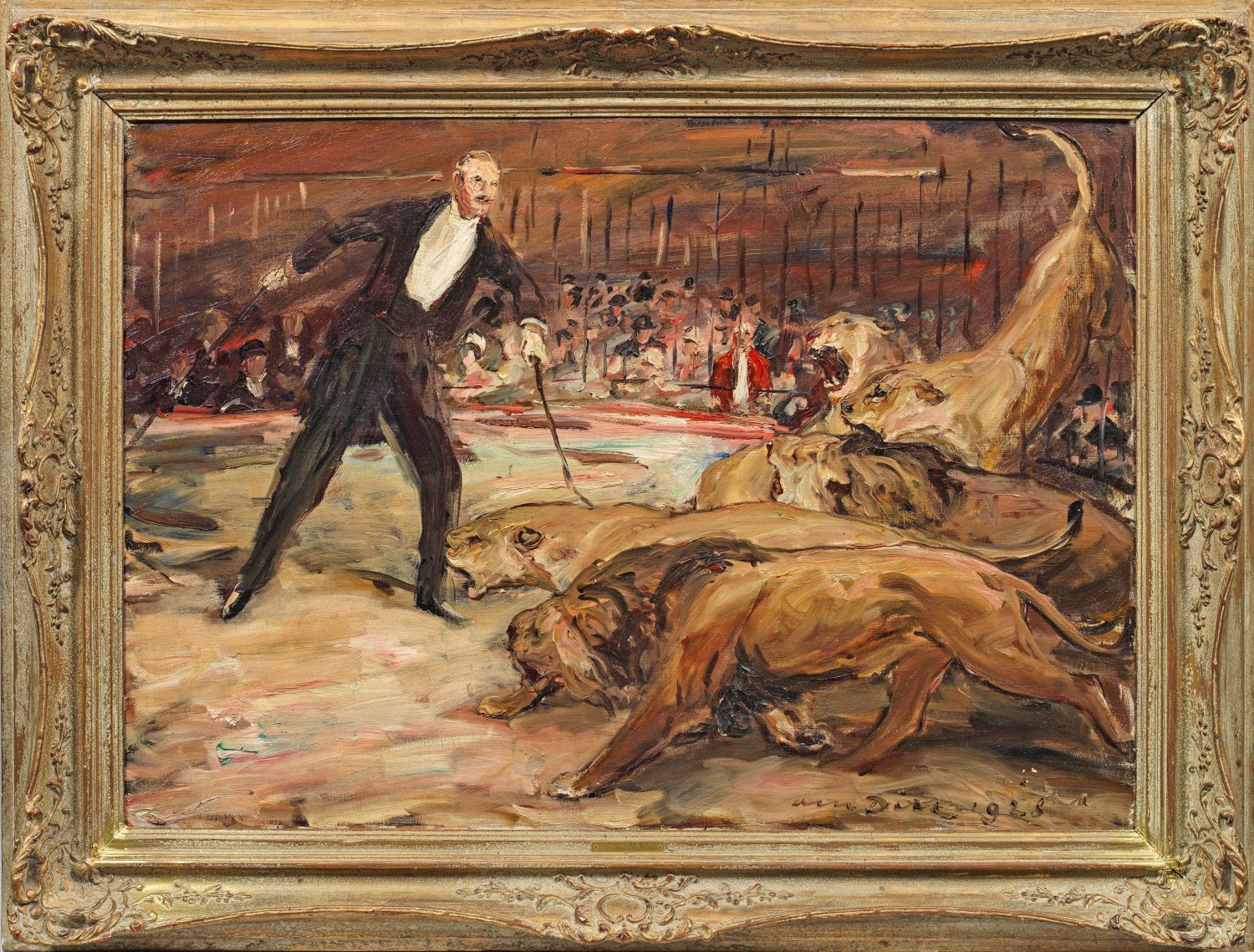 Szene aus dem Zirkus Krone in München. 1928 entstandenes, mit wuchtvollem, schnellem Duktus gemaltes Hauptwerk aus der besten Schaffensphase des Spätimpressionisten. Von prägendem Einfluss auf Dill und sein Oeuvre war der Tiermaler Heinrich von Zügel, bei dem er 1909-1913 Meisterschüler an der Münchener Akademie war. Bereits im Sommer 1917 war Dill mit einer ersten, umfangreichen Kollektion von 10 Ölgemälden und 15 Zeichnungen bei der Ausstellung im Münchener Glaspalast vertreten. Seit dieser Ausstellung waren Reiter- und Pferdemotive sowie Löwen und andere Raubkatzen Hauptsujets seines Oeuvres, so dass er auch als "Pferde-Dill" oder "Löwen-Dill" bekannt wurde. Als Mitglied der Münchner Sezession nahm er 1922-1930 an verschiedenen Ausstellungen der Künstlervereinigung teil. 1924 wurde ihm der Professorentitel verliehen. 1930 ging der Künstler von München nach Neustadt an der Weinstraße, 1941 zog er nach Bad Dürkheim, wo er bis zu seinem Tod 1957 lebte und arbeitete. Neben Max Slevogt zählt Otto Dill heute zu den bedeutendsten Künstlern der Klassischen Moderne aus der Pfalz. Öl/Lwd.; R. u. sign. u. dat. 1928. Verso überdies auf dem Keilrahmen sign., betitelt u. Bez. "Im Circus' Prof Otto Dill München"; Original-Etikett mit Bez. u. Betitelung "Dompteur mit Löwen" sowie Münchener Künstleradresse. 70 cm x 100 cm. Rahmen.