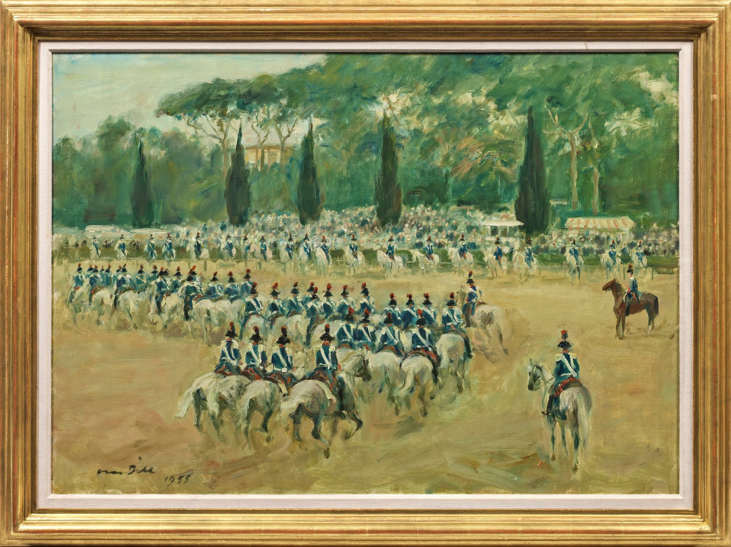 Vielfigurige Reiter-Szene auf der Piazza di Siena im Park der Villa Borghese in Rom, auf dem jedes Jahr ein internationales Pferdeturnier abgehalten wird. Geschildert wird das berühmte 4. berittene Carabinieri-Regiment (italienisch "4° Reggimento Carabinieri a Cavallo"), das in einer Reitschul-Parade ("Carousel") auch den Angriff der Carabinieri in der Schlacht von Pastrengo im Zuge des Ersten Italienischen Unabhängigkeitskrieges zwischen der piemontesischen und der österreichischen Armee 1848 nachstellt. Impressionistisches, mit leichtem, lockerem Duktus virtuos gemaltes Werk aus dem reifen, späten Oeuvre Otto Dills, gemalt 1955, zwei Jahre vor dem Tod des Künstlers. Otto Dill studierte 1908-1914 an der Münchener Akademie und war dort 1909-1913 Meisterschüler des Tiermalers Heinrich von Zügel, der ihn auch mit der Freilichtmalerei und mit dem Impressionismus vertraut machte. Die Darstellung von Pferden und Reitern, sei es bei Rennen, Turnieren, privaten Ausritten, Paraden oder auch als Kutschengespanne bildet neben Löwen und anderen Raubkatzen eines der zentralen Themen im Oeuvre Otto Dills. Bereits im Sommer 1917 war Dill mit einer ersten, ziemlich umfangreichen Kollektion von 10 Ölgemälden und 15 Zeichnungen bei der Ausstellung im Münchner Glaspalast vertreten. Als Mitglied der Münchner Sezession nahm er 1922-1930 an verschiedenen Ausstellungen der Künstlervereinigung teil. 1924 wurde ihm der Professorentitel verliehen, 1949 ernannte man ihm zum Ehrenmitglied der Akademie der Künste in München. 1930 ging der Künstler von München nach Neustadt an der Weinstraße, 1941 zog er nach Bad Dürkheim, wo er bis zu seinem Tod 1957 lebte und arbeitete. Neben Max Slevogt zählt Otto Dill heute zu den bedeutendsten Künstlern der Klassischen Moderne aus der Pfalz. Öl/Lwd.; L. u. sign. u. dat. 1955. Verso montiertes, großes Baumwoll-Etikett mit gesticktem Nachlass-Angaben und Nr. 142 von Emmy Dorothea Dill (1886 - 1967), Witwe des Künstlers; überdies auf Künstler-Etikett betitelt. 70 cm x 100 cm. Rahmen.