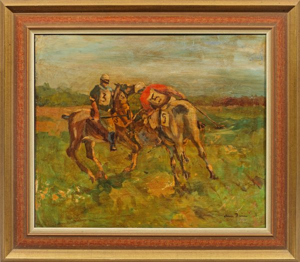 In virtuos schnellem Duktus gemaltes, teilw. pastos ausgeführtes, furios hingeworfenes Werk des Spätimpressionisten, wohl um 1950-1955. Werke, die den Jagd- und Pferdesport thematisieren, wie Galopp- und Trabrennen sowie Polospiele und Kutschengespanne, nahmen schon seit den 20er Jahren einen großen Raum in Dills Oeuvre ein. Hierin konnte er auch seine Meisterschaft in der Schilderung dynamisch schneller Bewegungen zum Ausdruck bringen. Dill besuchte oft Pferderennen und Polospiele, u. a. in München und Iffezheim bei Baden-Baden, die er mit großer Lebendigkeit und einem bestechenden Blick für die Pferde, Reiter und das mondäne Flair ins Bild setzte. 1908-1914 studierte er an der Münchener Akademie und war dort Meisterschüler Heinrich von Zügels. Bereits 1917 war Dill mit einer großen Kollektion von Gemälden und Zeichnungen im Glaspalast vertreten, 1922-1930 stellte er als Mitglied in der Münchner Sezession aus. 1924 wurde ihm der Professorentitel verliehen, 1949 ernannte man ihm zum Ehrenmitglied der Akademie der Künste in München. 1930 ging der Künstler von München nach Neustadt an der Weinstraße, 1941 zog er nach Bad Dürkheim. Neben Max Slevogt zählt Otto Dill heute zu den bedeutendsten Künstlern der Klassischen Moderne aus der Pfalz. Öl/Hartfaser. R. u. sign.; 50 cm x 59,5 cm. Rahmen.