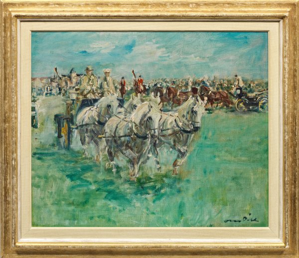 In virtuos schnellem Duktus gemalte, teilw. pastos ausgeführte, furios hingeworfene Freilichtimpression mit einem Vierspänner, um 1950. Werke, die den Jagd- und Pferdesport thematisieren, wie Galopp- und Trabrennen sowie Polospiele und Kutschengespanne, nahmen schon seit den 20er Jahren einen großen Raum in Dills Oeuvre ein. Hierin konnte er auch seine Meisterschaft in der Schilderung schneller Bewegungen zum Ausdruck bringen. Dill besuchte oft Pferderennen und Polospiele, u. a. in München und Iffezheim bei Baden-Baden, die er mit großer Lebendigkeit und einem bestechenden Blick für die Pferde, Reiter und das mondäne Flair ins Bild setzte. 1908-1914 studierte er an der Münchner Akademie und war dort Meisterschüler Heinrich von Zügels. Bereits 1917 war Dill mit einer großen Kollektion von Gemälden und Zeichnungen im Glaspalast vertreten, 1922-1930 stellte er als Mitglied in der Münchner Sezession aus. 1924 wurde ihm der Professorentitel verliehen, 1949 ernannte man ihm zum Ehrenmitglied der Akademie der Künste in München. 1930 ging der Künstler von München nach Neustadt an der Weinstraße, 1941 zog er nach Bad Dürkheim. Neben Max Slevogt zählt Otto Dill heute zu den bedeutendsten Künstlern der Klassischen Moderne aus der Pfalz. Öl/Lwd.; R. u. sign.; Verso Künstler-Stempel und Atelier-Etikett mit Betitelung und Ortsangabe Bad Dürkheim, Galerie-Etikett des Kunsthauses Bühler, Stuttgart. 50 cm x 60 cm. Rahmen.