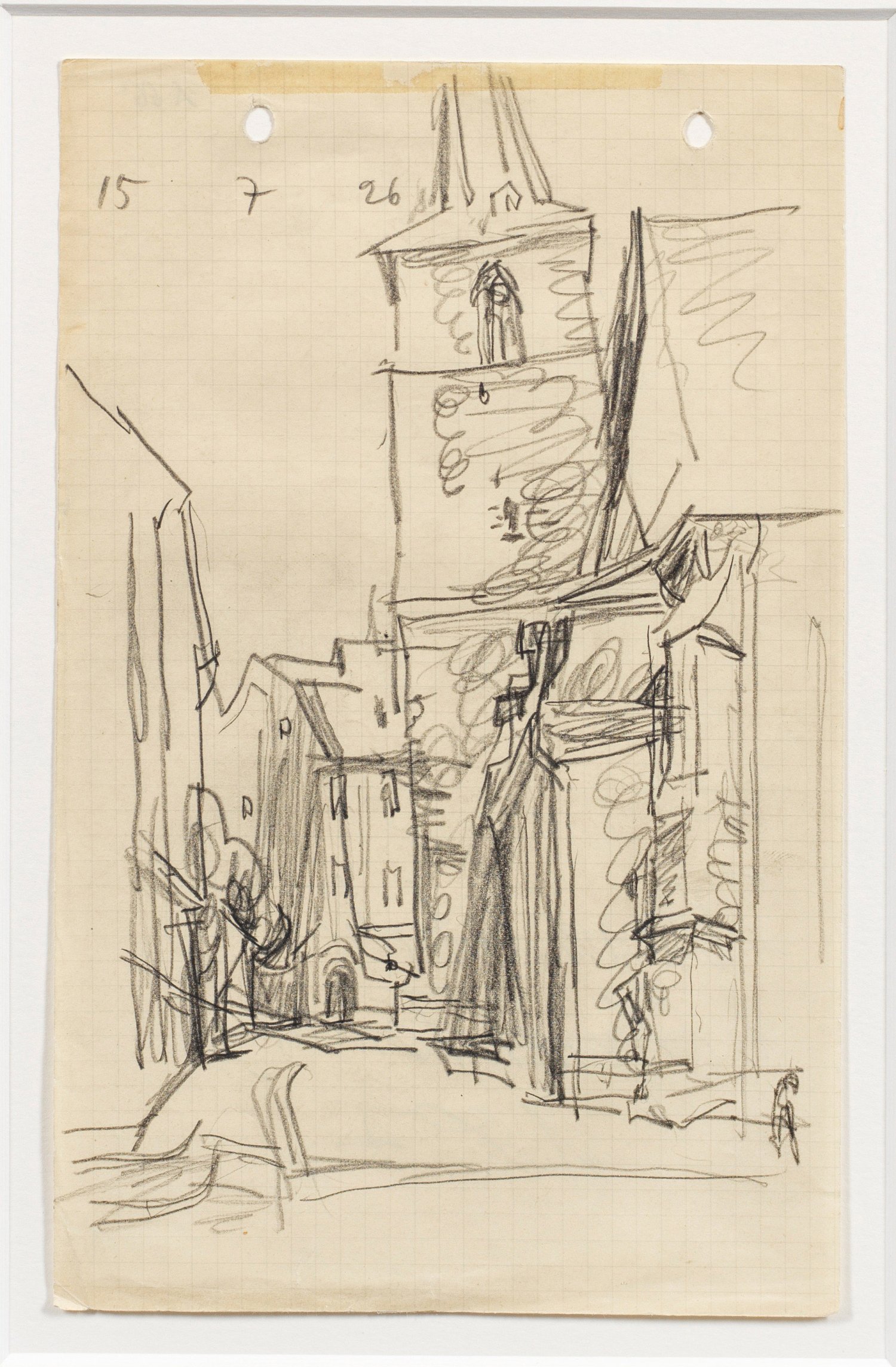 Im Juli 1926 wohl in der Umgebung von Weimar entstandene Studie Feiningers, in dessen Oeuvre Kirchen und Kirchtürme als Motive einen bedeutenden Schwerpunkt sowohl für seine Gemälde als auch Zeichnungen, Aquarelle und Grafiken darstellen. Besonders die Gestalt hoch aufragender, spitzer, nadelartiger Türme wie der von Gelmeroda inspirierten ihn zu kristallinen Kompositionen. 1919 wurde Feininger gleich nach Gründung des Staatlichen Bauhauses als erster Bauhaus-Meister von Walter Gropius nach Weimar berufen, wo er bis 1926 lebte und bis 1925 als Meister die Druckwerkstätten leitete. Am 30. Juli 1926 bezog Feininger mit seiner Familie eines der neu errichteten Meisterhäuser in Dessau, blieb zwar formal bis 1932 "Meister" am Bauhaus, war jedoch von sämtlichen Lehrverpflichtungen entbunden. Nach der erzwungenen Schließung des Dessauer Bauhauses 1932 zog Feininger nach Berlin, 1937 ging er endgültig in die USA zurück. In der Zeit des Nationalsozialismus galten Feiningers Werke offiziell als "Entartete Kunst", 378 Arbeiten des Künstlers wurden aus öffentlichen Sammlungen beschlagnahmt. Bleistift/kariertes Papier mit Doppel-Lochung. Oberhalb dat. "15(.)7(.19)26". 22,5 cm x 14,5 cm. Rahmen.