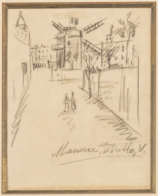 Mit wenigen, schnellen Strichen erfasste Vedute Utrillos, im Hintergrund die Basilika Sacré-Coeur. Neben Utrillo, der die Moulin de la Galette und Montmartre oftmals darstellte, haben auch andere bedeutende Künstler wie Vincent van Gogh die alte Mühle verewigt. Bleistift/Papier. R. u. sign.; Oberhalb der Mühle ger. rest.; am unteren Rand außerhalb des Passepartoutausschnitts gebräunt. 22 cm x 16 cm. Rahmen.