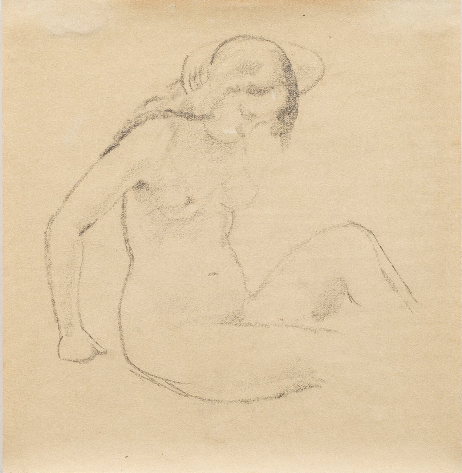 Gekonnt flüchtig skizzierter weiblicher Akt, der sich sitzend auf der rechten Faust abstützt und mit der linken Hand die Haare aus dem Gesicht nimmt. Die vier Jahre vor dem I. Weltkrieg gehörten zu den stärksten im Oeuvre Mackes, der sich auf dem künstlerischen Gipfel befand, während in diesem Zeitraum mehrere Entwicklungen in der Kunst der Moderne kulminierten. Traumverlorene Parkszenen und Mädchen wurden zentrale Motive des Expressionisten. 1910 begegnete er Franz Marc, der ein enger Künstlerfreund wurde, 1911 schloss er sich der von Marc und Wassily Kandinsky angeführten Künstlergruppe des "Blauen Reiter" an, an deren Almanach und Ausstellungen er sich beteiligte. Einer der letzten Höhepunkte in Mackes künstlerischem Leben war die Tunis-Reise, die er im April 1914 mit den Schweizer Malern Louis Moilliet und Paul Klee unternahm und von der er mit einer Fülle großartiger Aquarelle zurückkehrte. Bleistift/Papier. Verso vermutlich von seiner Witwe Elisabeth Erdmann-Macke handschriftlich mit Künstlervermerk, Titel, Ortsangabe Bonn und Dat. 1911 sowie dem Nachlassstempel (Lugt 1775b). Auf dem Passepartout ebenfalls von derselben Hand mit Künstlervermerk, Titel und Datierung sowie der Nachlassstempel mit handschriftlicher Nr. BZ 2.24. Ca. 19,8 cm x 19,4 cm. Rahmen.