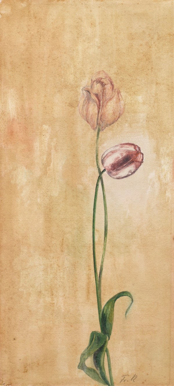 Sehr frühes Stillleben Radziwills mit zwei langstieligen Tulpen vor neutralem Hintergrund, entstanden 1924 kurz nach seiner Hinwendung zur Neuen Sachlichkeit bzw. dem Magischen Realismus, nachdem er 1923 endgültig in Dangast ansässig geworden war. 1924 nahm Radziwill an der Juryfreien Kunstschau in Berlin mit einer Sonderschau von 17 eigenen Gemälden neben Giorgio de Chirico, Paul Klee, Oskar Schlemmer, Otto Dix und Wassily Kandinsky teil. 1925 hatte Radziwill eine erste Einzelausstellung in Oldenburg mit 60 Arbeiten. Später griff er das Tulpen-Motiv in mehreren, umfangreicheren Stillleben-Gemälden wieder auf - "Drei Tulpen" (1934/1935, Wvz. 411), "Die rote Tulpe" (1942, Wvz. 517), "Zwei Tulpen (1943, Wvz. 521), außerdem in ähnlich gestreckt hochformatigen, konzentrierten Darstellungen von Blumenstängeln wie "Tulpen gegen schwarz und weiß" (1946, Wvz. 562) und "Weiße Tulpe" (1952, Wvz. 664). Aquarell u. Gouache/Papier. R. u. monogr. "Fr. R.". Verso mit Werk-Nr. 201 versehen u. "1924" [sic.] dat., Stempel "Franz Radziwill (/) Nordseebad Dangast b. Varel i. O." und ein weiterer, runder, undeutl. Stempel. 27,3 cm x 17 cm. Rahmen.