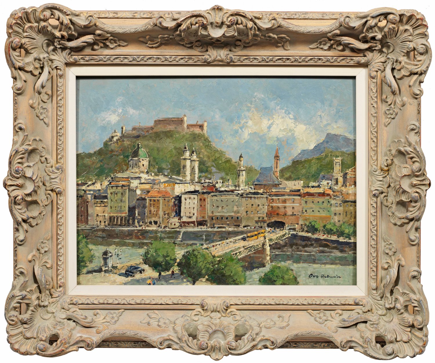 Stimmungsvolle Salzburgvedute mit Blick über die Salzach, im Hintergrund erhebt sich hoch über den Dächern der Stadt majestätisch die Festung Hohensalzburg. Schwungvoll und dynamisch ausgeführtes, repräsentatives Werk des Weilheimer Künstlers, der Schüler bei C. O. Müller und Prof. Wilhelm Funk war. Öl/Masonit. R. u. sign.; Verso Ortsangabe Salzburg und Künstlerangabe bzw. -signatur. 30 cm x 40 cm. Rahmen.