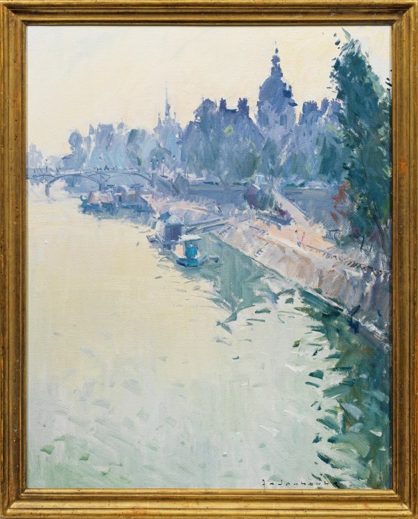 Blick auf die Seine am Institut de France. Mit schnellem, breitem, weich-pastosem Duktus in hellem, pastelltonigem Kolorit gemalte, spätimpressionistische Paris-Ansicht. Anderbouhr stellte erstmals 1937/38 im Salon d'Automne in Paris aus; 1953-1973 arbeitete er mit der renommierten Galerie Durand-Ruel zusammen, die elf Einzelausstellungen arrangierte. Neben Paris-Motiven als sein Haupt-Thema schilderte er auch Ansichten und Landschaften aus anderen französischen Regionen, Italien, Spanien und Marokko. Öl/Lwd.; R. u. sign.; Verso auf einem Etikett vom Künstler bez. u. betitelt. 92 cm x 73,5 cm. Rahmen.
