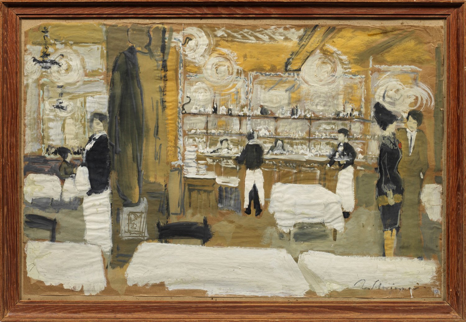 Lebendig geschilderte, expressiv-realistische Szene mit Kellnern in Livree und galanten Gästen. Für Schwimmers Oeuvre außergewöhnlich großes Blatt, der sonst kleine Formate für seine unmittelbar geschaffenen Darstellungen bevorzugte. Schwimmer lehrte bis zu seiner Entlassung durch die Nationalsozialisten 1933 an der Kunstgewerbeschule in Leipzig, 1937 wurden in der Aktion "Entartete Kunst" auch Werke Schwimmers vernichtet. 1946-1950 war Schwimmer Professor an der Staatl. Akademie für Graphische Künste und Buchgewerbe in Leipzig; seit 1951 leitete er die Grafik-Abteilung der Dresdener Hochschule für Bildende Künste. Mischtechnik (Gouache)/Velin, auf Karton kaschiert. R. u. sign.; Ca. 49,5 cm x 77 cm. Rahmen.