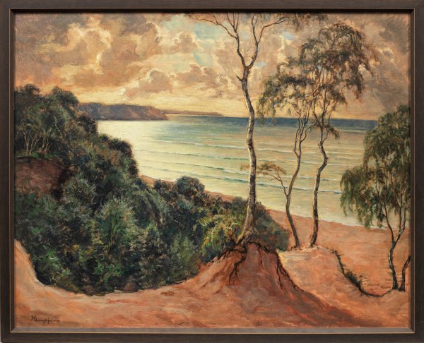 Impressionistisch umgesetzte, abendliche Landschaft der Ostseeküste beim Seebadeort Rauschen (heute Swetlogorsk) in Ostpreußen. Hempfing, ausgebildet an der Karlsruher Akademie, zählt zu den bedeutendsten süddeutschen Freilichtmalern seiner Generation. Er zeigte seine Gemälde 1911-1914 u. a. im Glaspalast in München, im Künstlerhaus in Wien und auf der Großen Kunstausstellung in Berlin. Öl/Hartfaser. L. u. sign.; Verso betitelt. 80 cm x 100 cm. Rahmen.