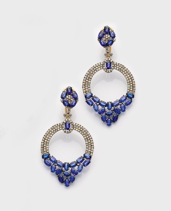 Pair of earrings set with nearly cornflower blue sapphires approx. 16,59 ct. and diamonds approx. 2,46 ct., in 14 k gold and silver.
