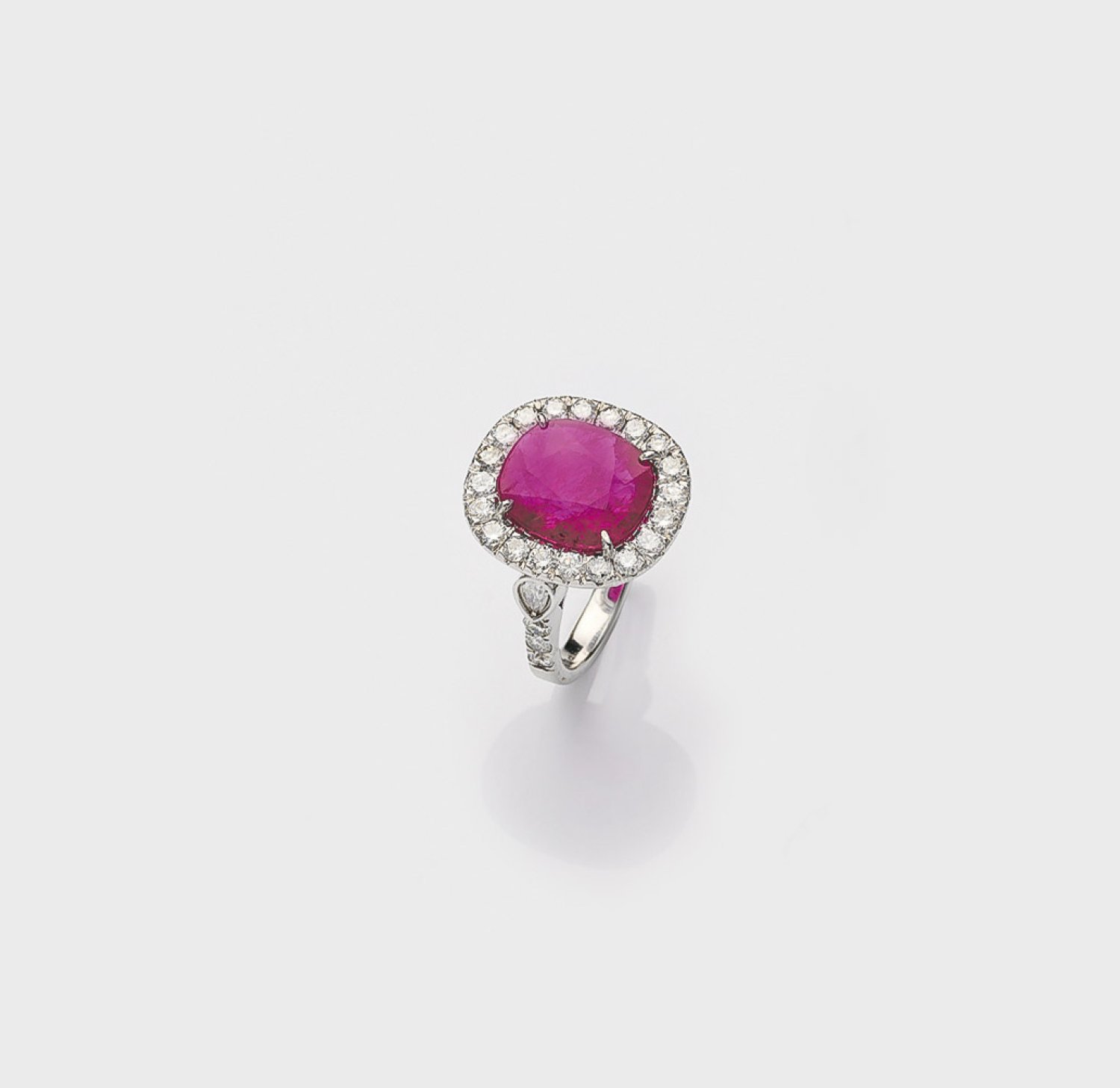 Weißgold, gest. 750. Zentral besetzt mit einem Red-Pink-Rubin (no treatment) von ca. 5,09 ct., entouriert von Brillanten von zus. ca. 1,53 ct.; Gew. ca. 7,72 g.