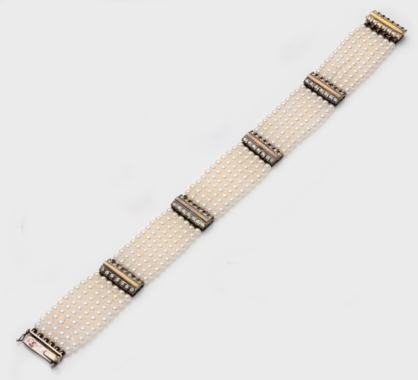 Roségold, gest. 750. Sechsreihiges Armband aus weißen Akoyaperlen von ca. 3 mm in farbintensivem, rosé-grün changierendem Lüster, unterteilt von Diamant besetzten Stegelementen von zus. ca. 0,30 ct. (vvsi/w). Gew. ca. 20 g.