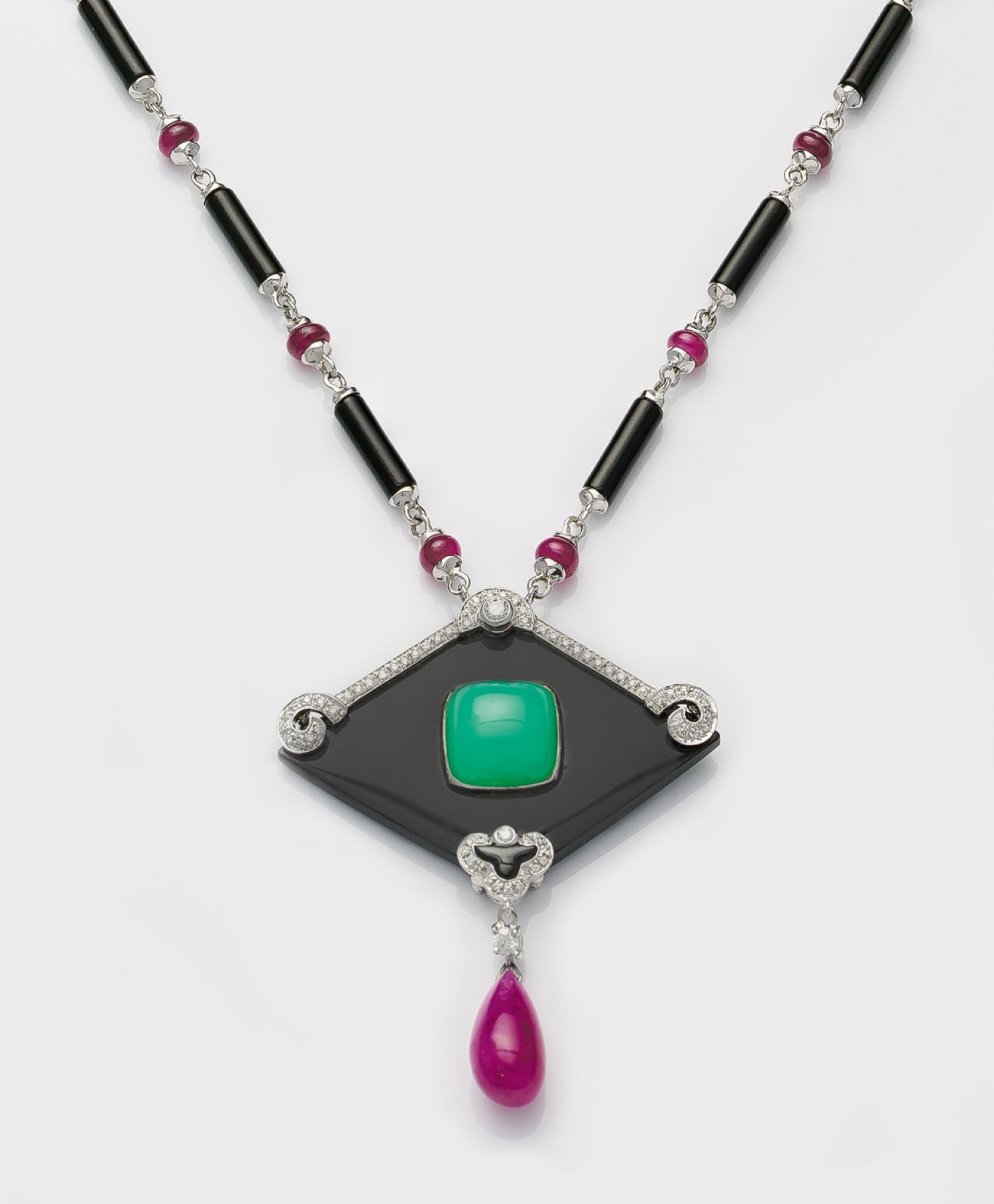 Necklace and pendant set with black onyx, pigeon blood red rubies approx. 14 ct., chrysoprase approx. 2,35 ct. and diamonds approx. 0,47 ct., in 18 k white gold.