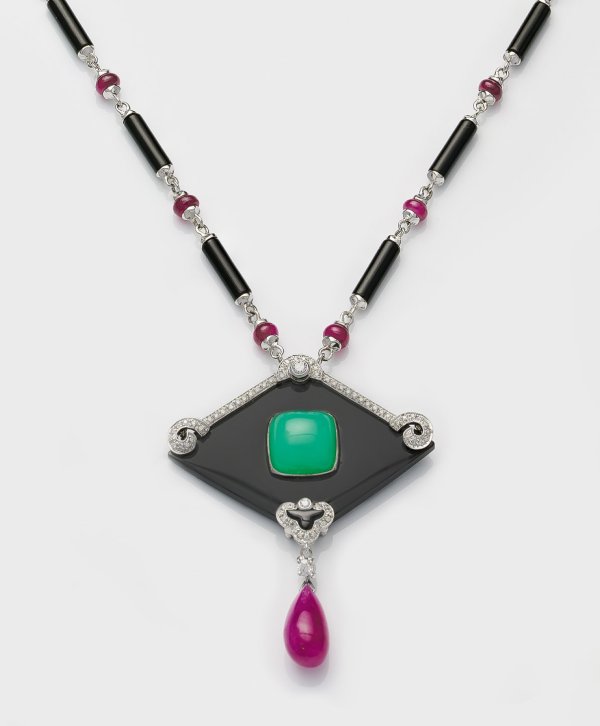 Weißgold, gest. 750. Collier-Kette und korrespondierender Anhänger aus schwarzem Onyx, taubenblutroten Rubinen von zus. ca. 14 ct., mintgrünem Chrysopras von ca. 2,35 ct. sowie Brillanten von zus. ca. 0,47 ct.; Ges.-Gew. ca. 32,29 g.