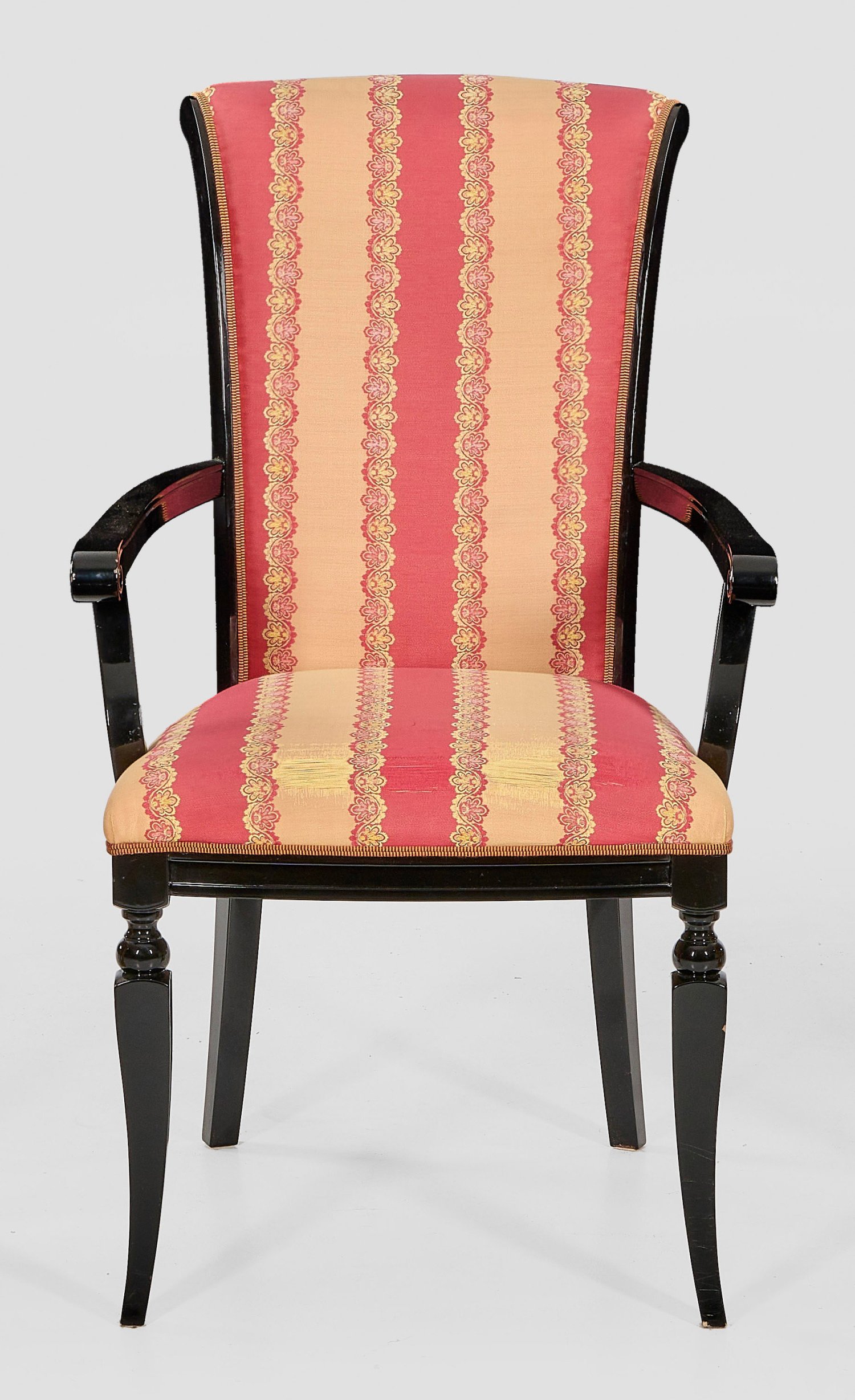 Holz, schwarz lackiert. Trapezförmige, profilierte Zarge aus leicht ausgestellten Vierkantbeinen mit Kugelelementen. Geschweifte Stützen für gebogte Armlehnen sowie zurückschwingende Rückenlehne. Gepolstert und bezogen. Sitz-H. 51 cm.