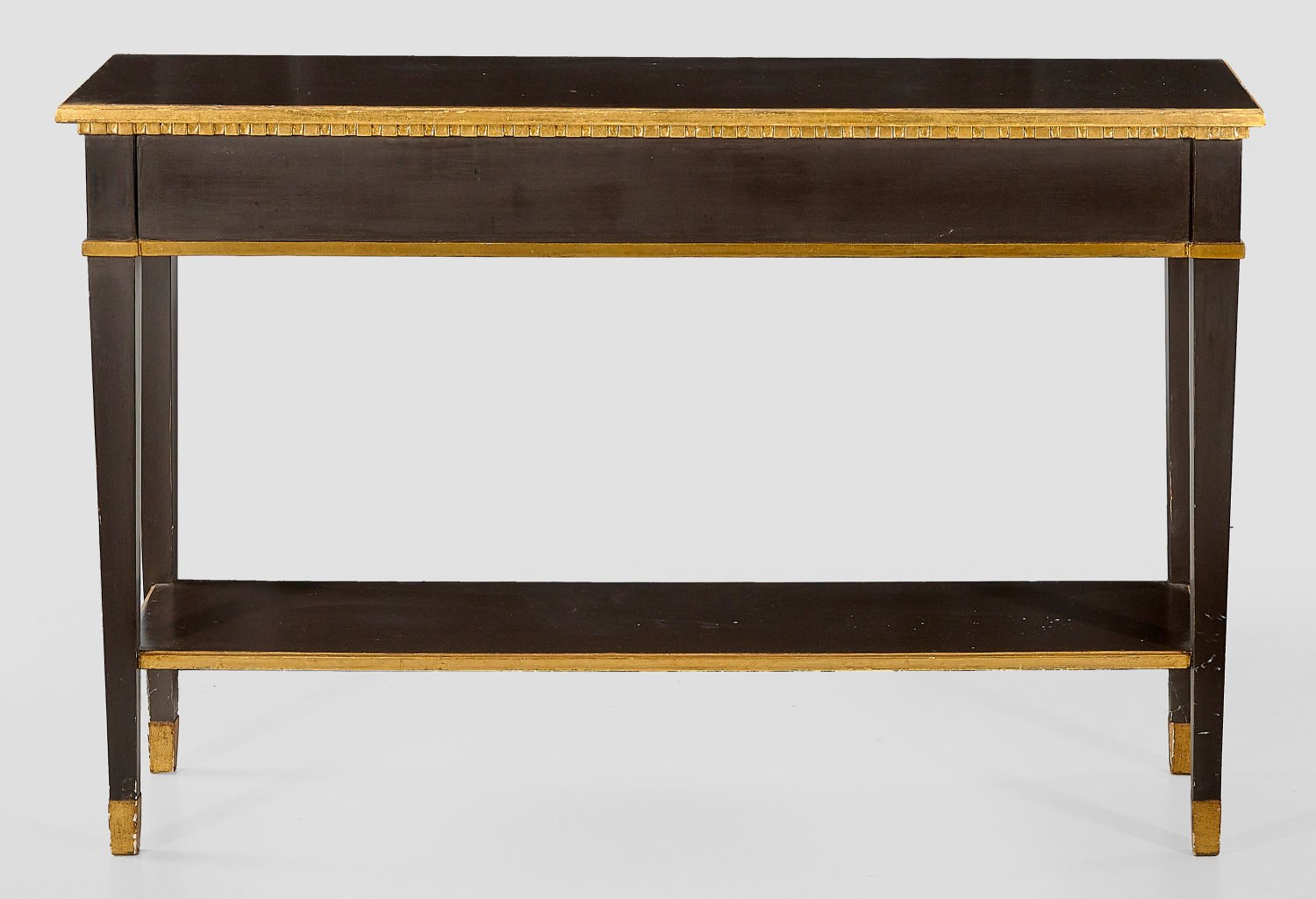 Holz, schwarz gefasst und teilw. vergoldet. Gerade Zarge mit umlaufendm Zahnfries auf konischen Vierkantbeinen, unterhalb durch breites Ablagefach verbunden. Gering überstehende, rechteckige Deckplatte. H. 80 cm. 125 cm x 38 cm.