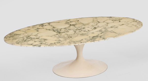 Aluminiumguss, weiß lackiert sowie weißer, grau gemaserter Marmor. Geschweift ansteigender Tulpenfuß als Träger für ovale Deckplatte. Herstellerzeichen. Entw. Eero Saarinen, 1950er Jahre. Altersspuren. H. 38 cm. 134 cm x 90 cm.