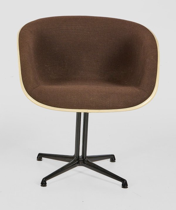 Cremefarbenes Fiberglas und schwarz lackiertes Metall. Sog. La Fonda-Base aus gegeneinander gestellten Streben als Träger für organisch geformte Sitzschale mit dunklem sog. Hopsak-Bezug. Herstelleretikett "Herman Miller made by Vitra". Entw. Charles & Ray Eames, 1961 für das New Yorker Restaurant "La Fonda del Sol". Sitz-H. 46 cm.