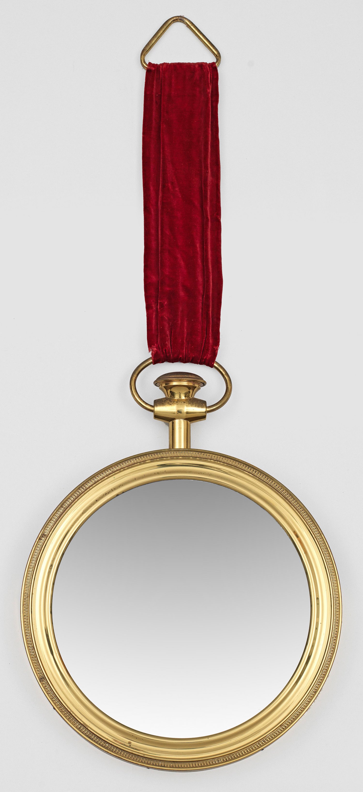 Messing. Runde Spiegelrahmung in Form einer stilisierten Taschenuhr, umlaufend mit schmalem Palmettenfries. Aufhängung an breitem Samtband. Facettiertes Spiegelglas, besch.; Entw. Piero Fornasetti. Ges.-H. 102 cm.