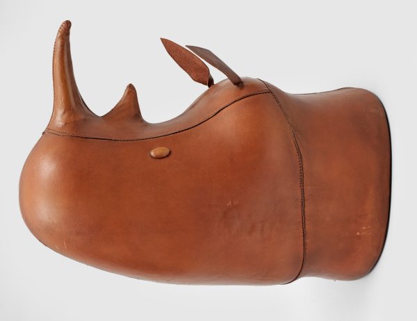 bzw. Gaderobenhalter. Hellbraunes, patiniertes Leder. Plastisch gestalteter Korpus in Form eines stilisierten Rhinozeros-Kopfes. Unbez.; Entw. Dimitri Omersa, 1960er Jahre. H. 30 cm. H. 54 cm.