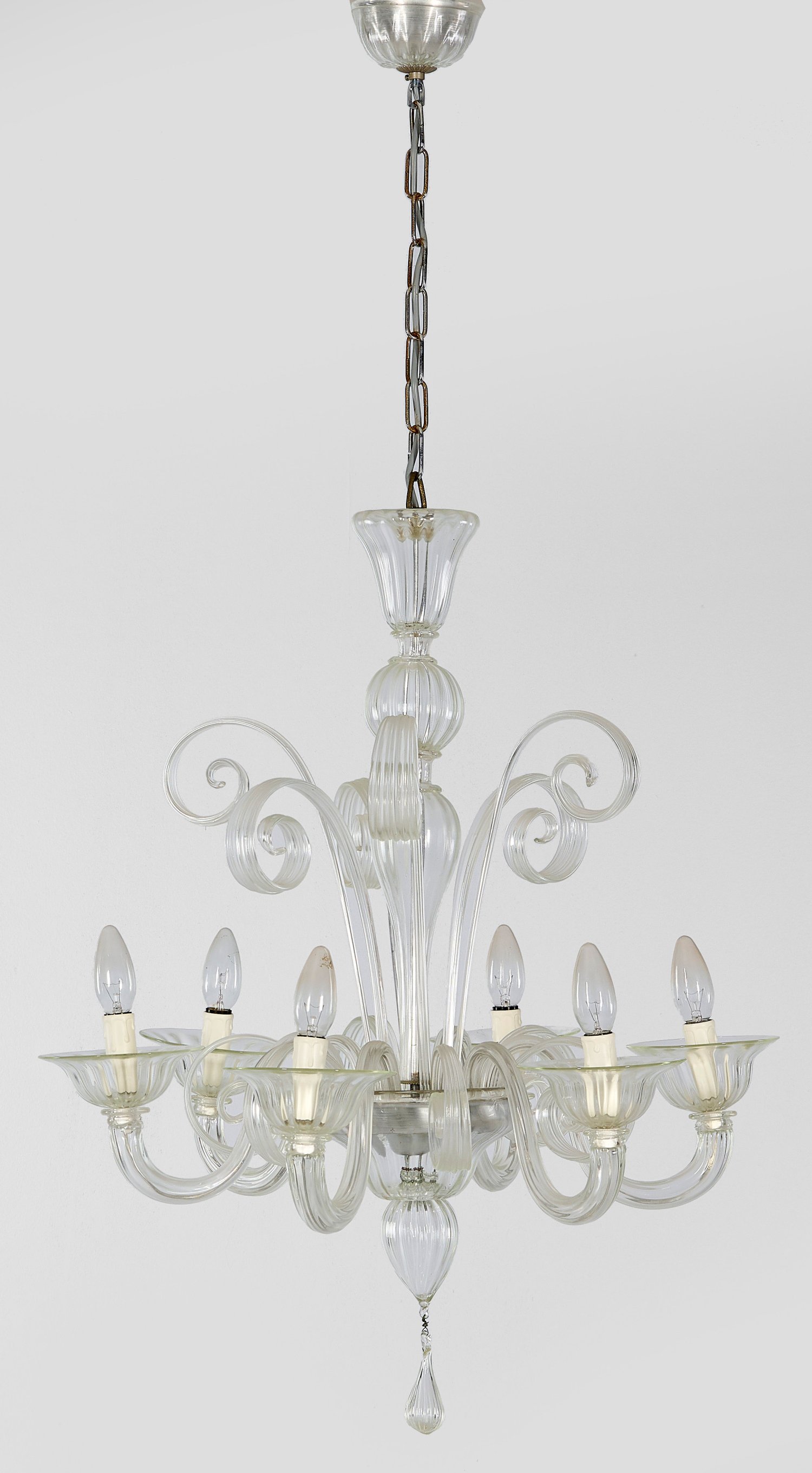 6-flg.; Farbloses Glas. Mehrfach gegliederter Balusterschaft, davon ausgehend stark geschwungene Leuchterarme als Träger für Leuchtmittel mit kelchförmigen Traufschalen. Oberhalb gestreckte Voluten. Kettenaufhängung. Elektrifiziert. Ges.-H. 120 cm. Lampen-H. 78 cm. D. 60 cm.