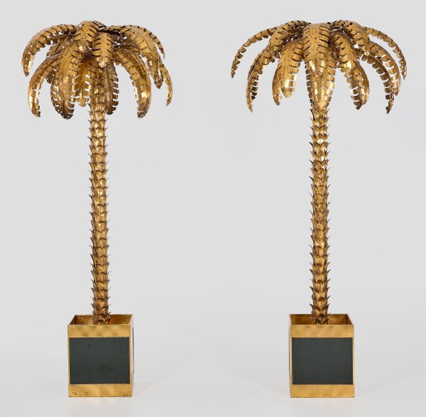 2-flg.; Metall, vergoldet sowie schwarzes Glas. Über gekantetem Sockel naturalistisch gestalteter Korpus in Form einer großen Palme mit stark geschwungenen Palmwedeln als Träger für Leuchtmittel. H. 178 cm.