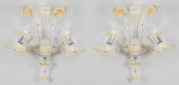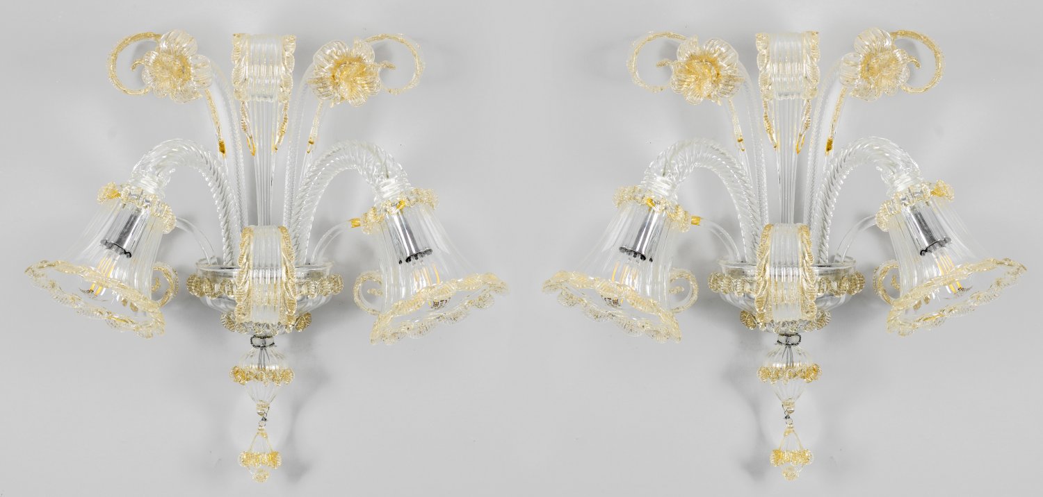 Modell 4683/2. 2-flg.; Farbloses Muranoglas, teilw. mit Goldflitterdekor. Balusterförmiger Korpus. Davon ausgehend stark geschwungene, in sich gedrehte Leuchterarme mit kelchförmigen Lampenschirmen. Dekorationen aus eingerollten Lanzettblättern sowie Blütenstielen. Elektrifiziert. Unbez.; H. 44 cm.