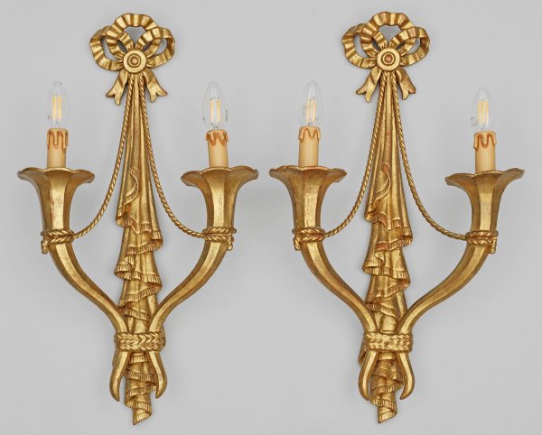 2-flg.; Holz, gefasst und vergoldet. Schmales Wandschild aus Draperiewerk mit großer Schleifenbekrönung sowie gekantete, sich trichterförmig weitende Leuchterarme mit vasenförmigen Tüllen. Herstellerzeichen. Elektrifiziert. H. 56 cm.